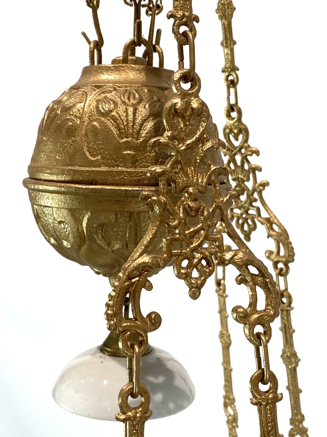 Large kerosene lamp of patinated brass and shade of white opaline glass from around the 1880s. The lamp is in great antique condition.