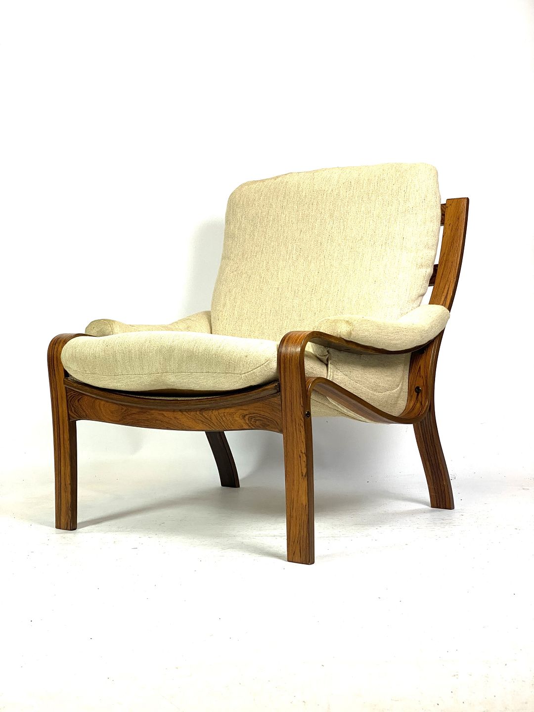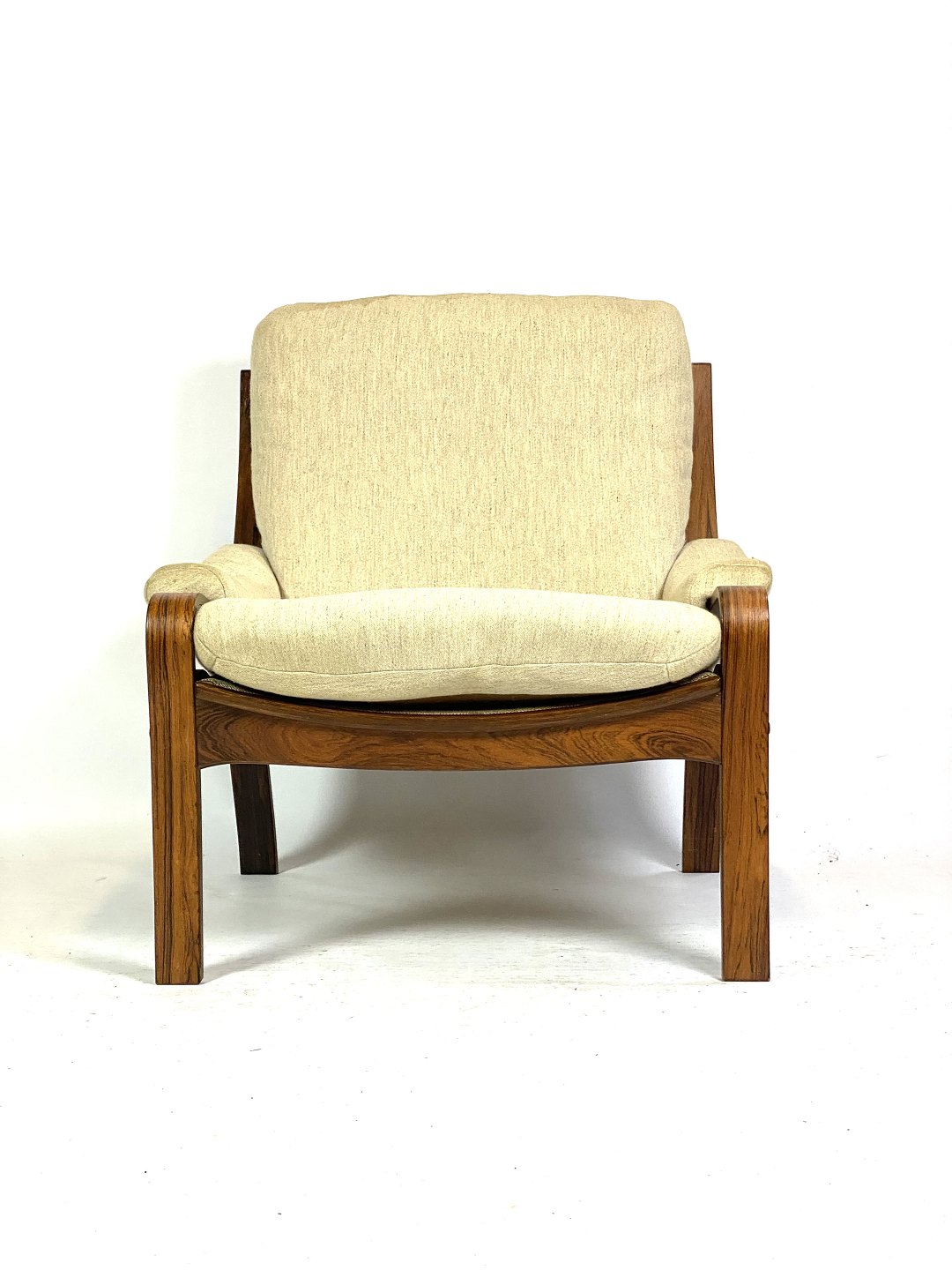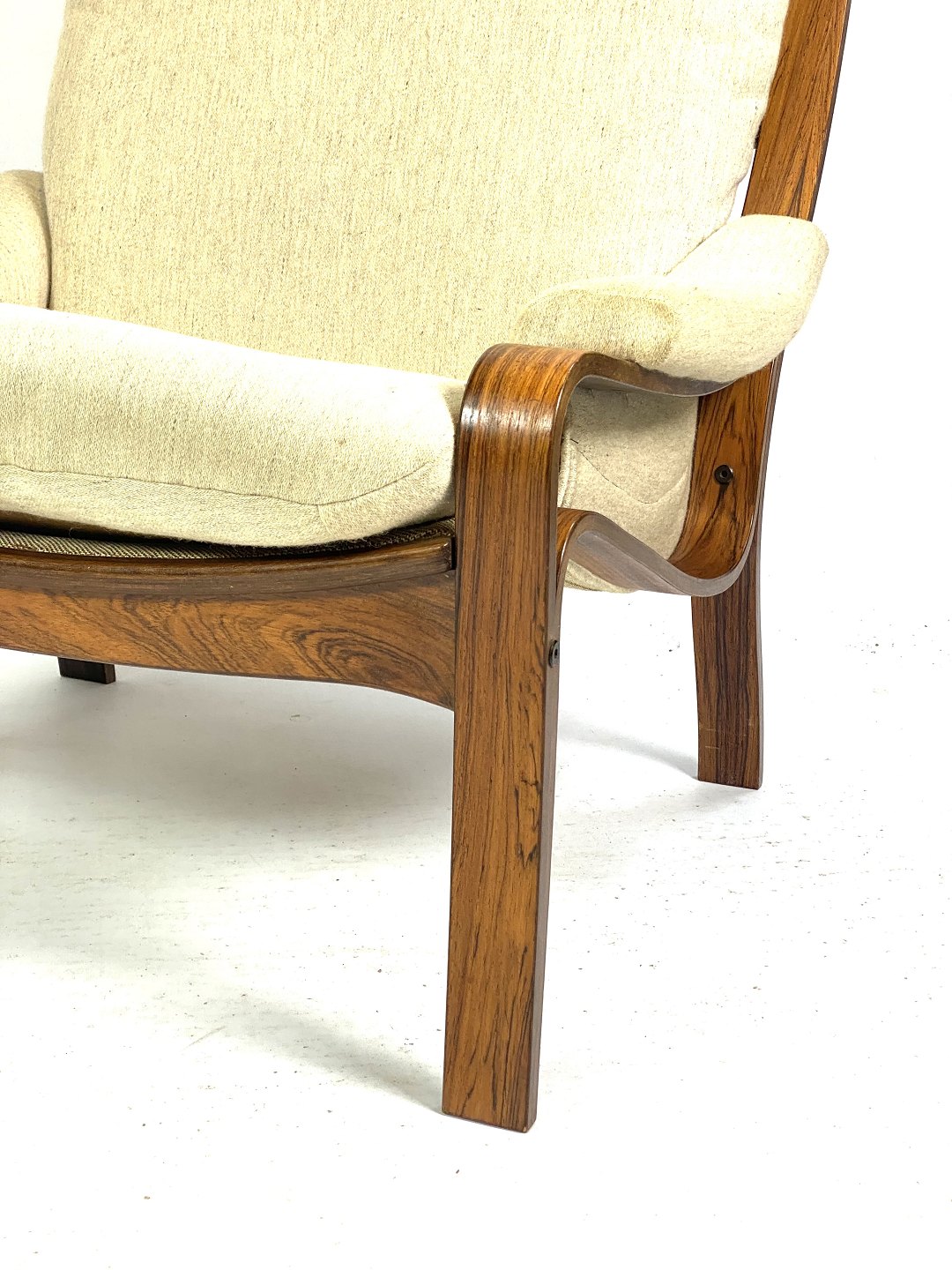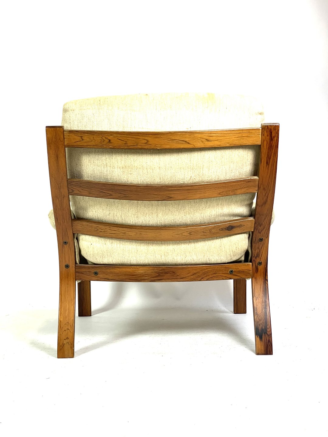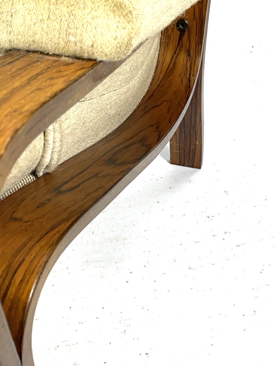 The warm tones and beautiful natural pattern of the rosewood give the chair a luxurious and sophisticated look that will add a classy atmosphere to any living room or living room. The light fabric on the seat and backrest adds a light and inviting touch to the chair, inviting relaxation and comfort.