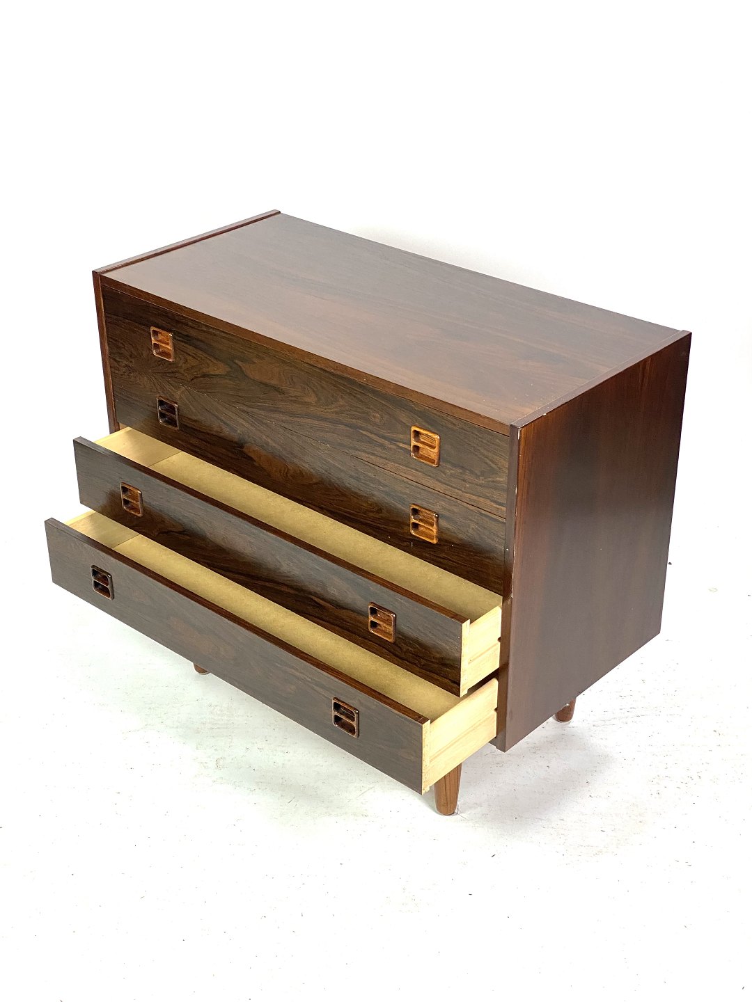 Denne kommode i palisander, designet af danske møbel arkitekter i 1960'erne, er et smukt eksempel på æstetikken fra den tid. Palisandertræet giver kommoden en varm og naturlig glød, mens dens tidløse design bringer et strejf af elegance til ethvert rum.