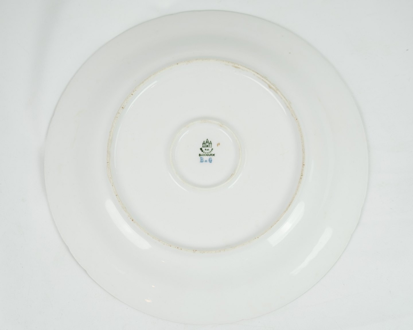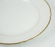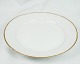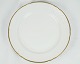 Et rundt fad i Bing & Grøndahl i mønstret Hartmann med en guldkant.