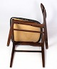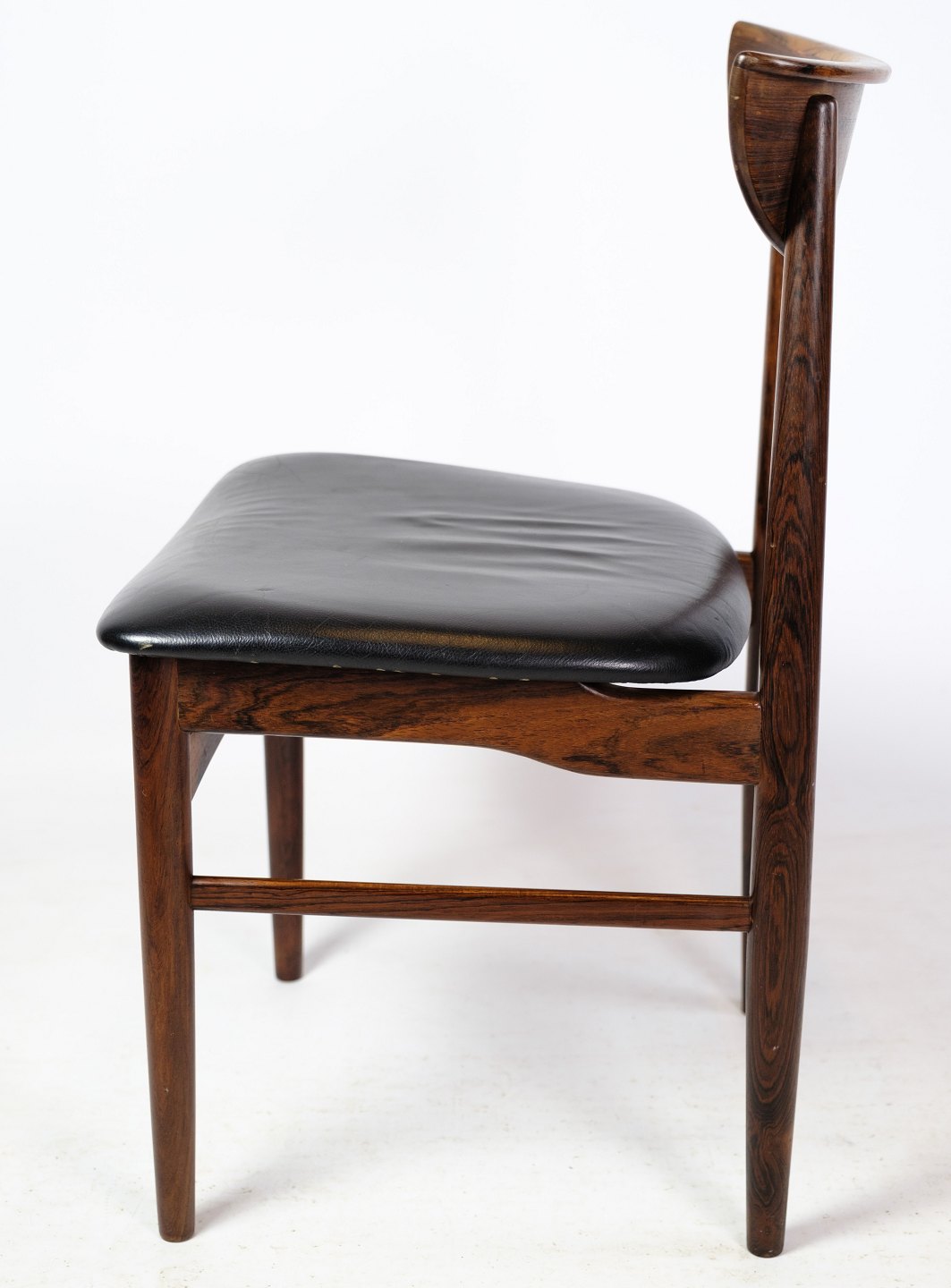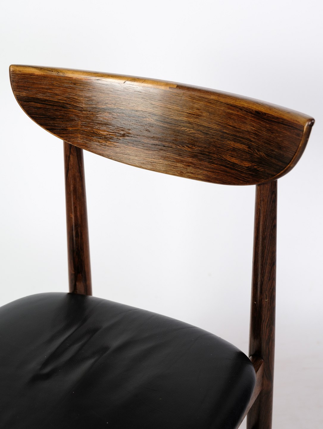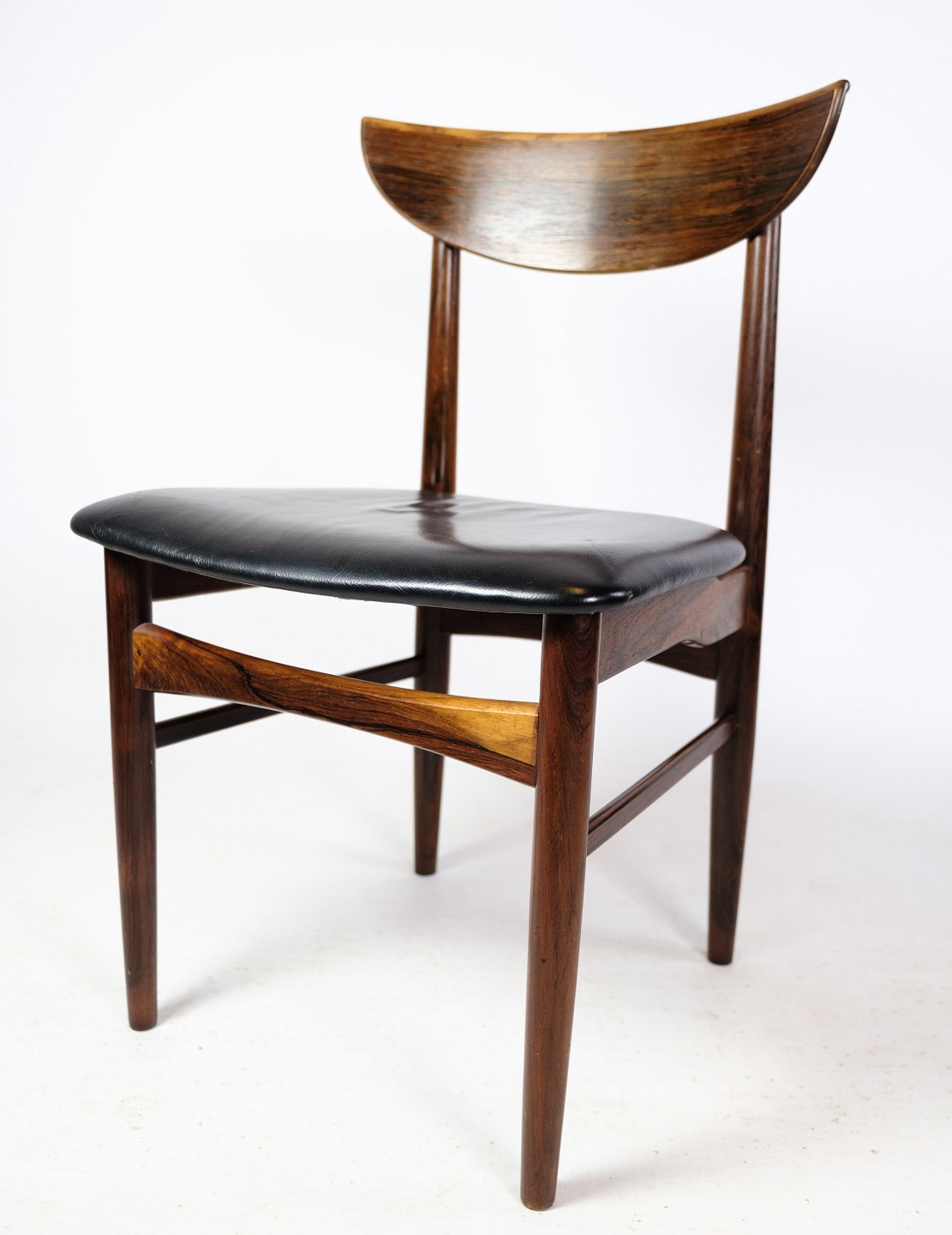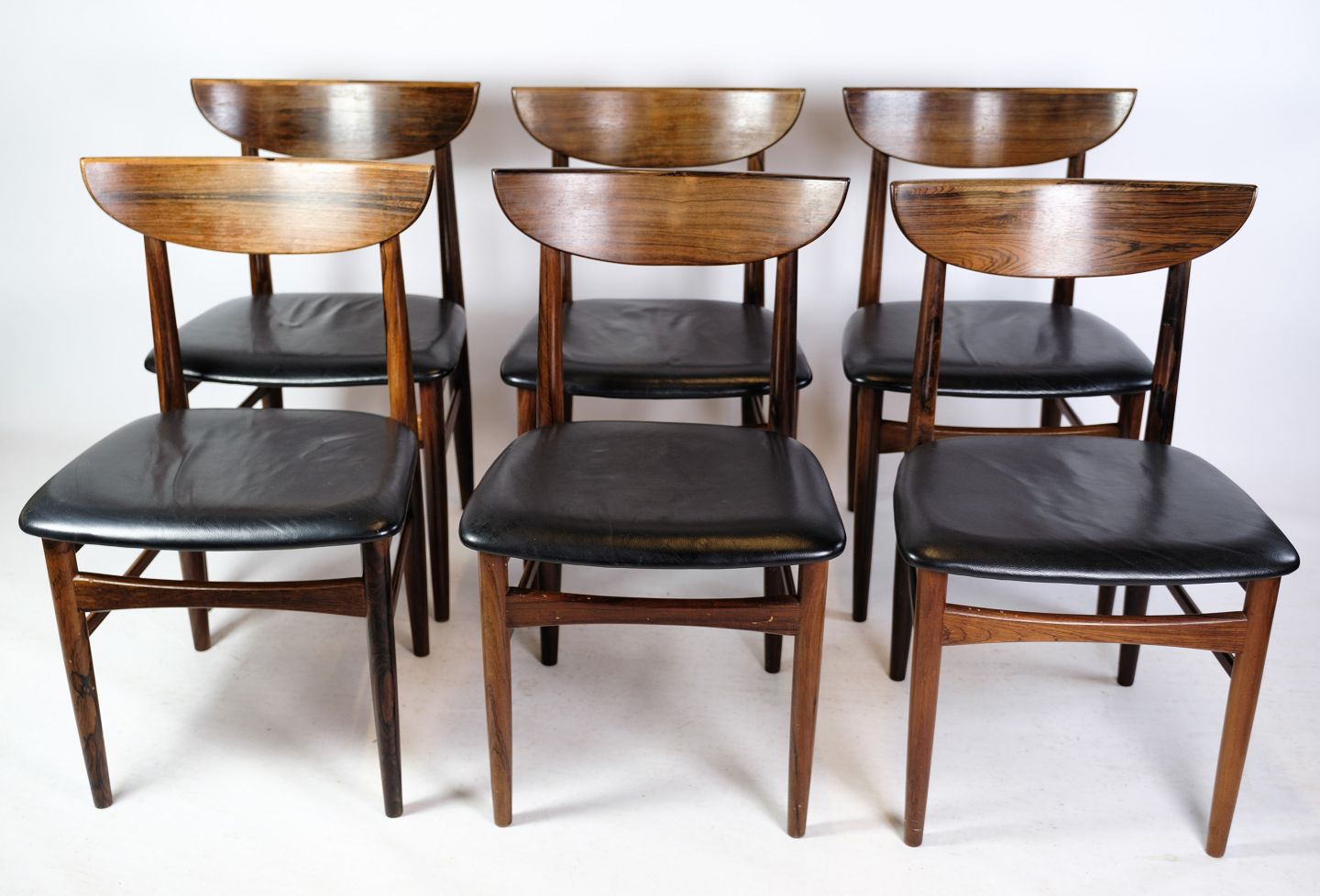 Et sæt af seks spisebordsstole af dansk design i palisander med sort læder fra omkring år 1960'erne. Alle står i meget god stand.