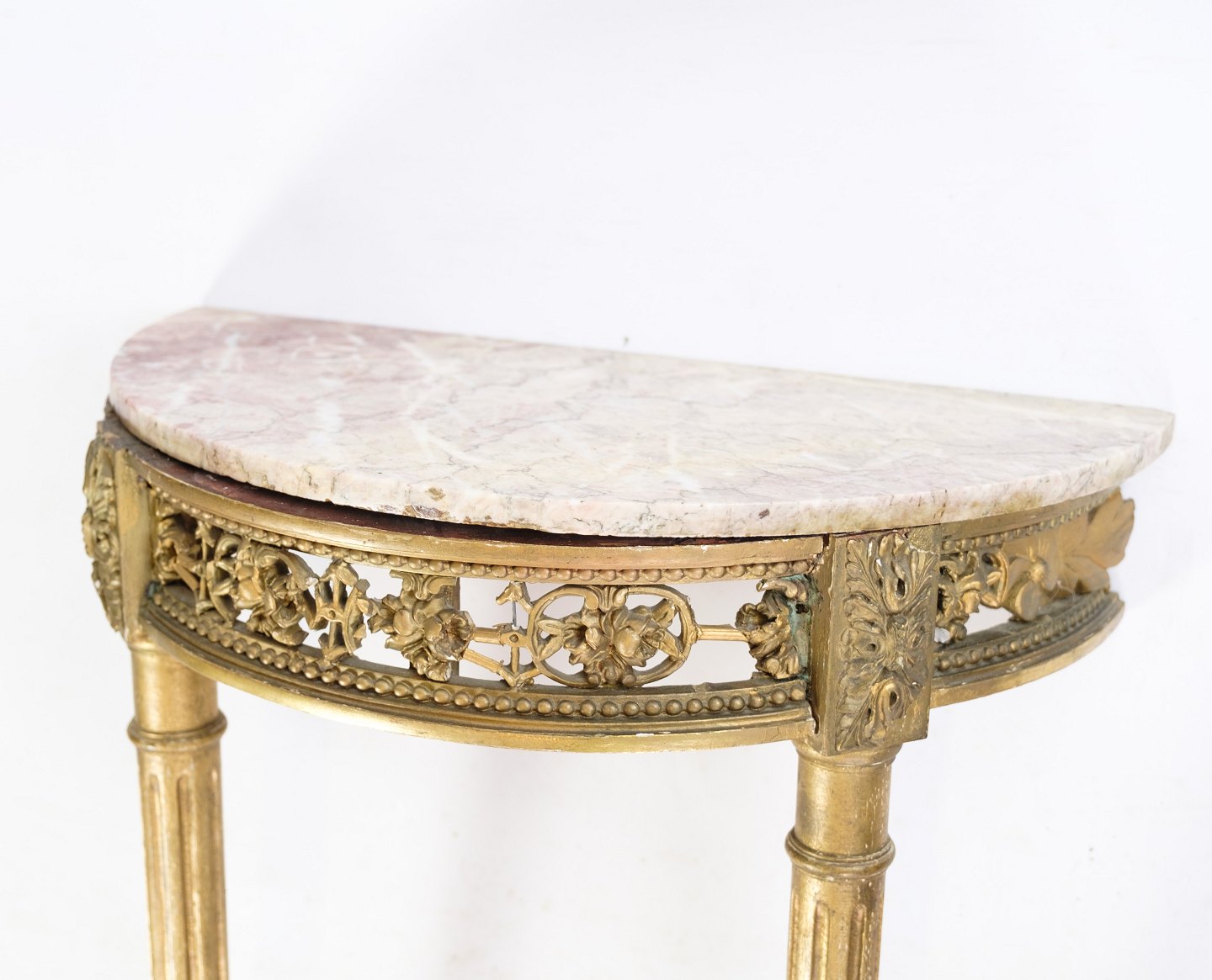 Gold-plated console table from Denmark with white marble top from the period Louis Seize from around the year 1790s.