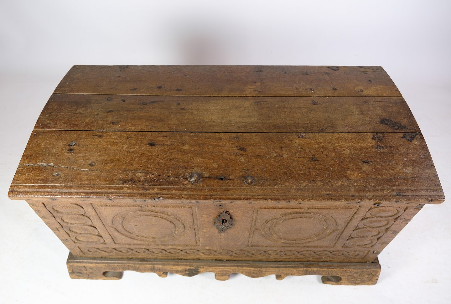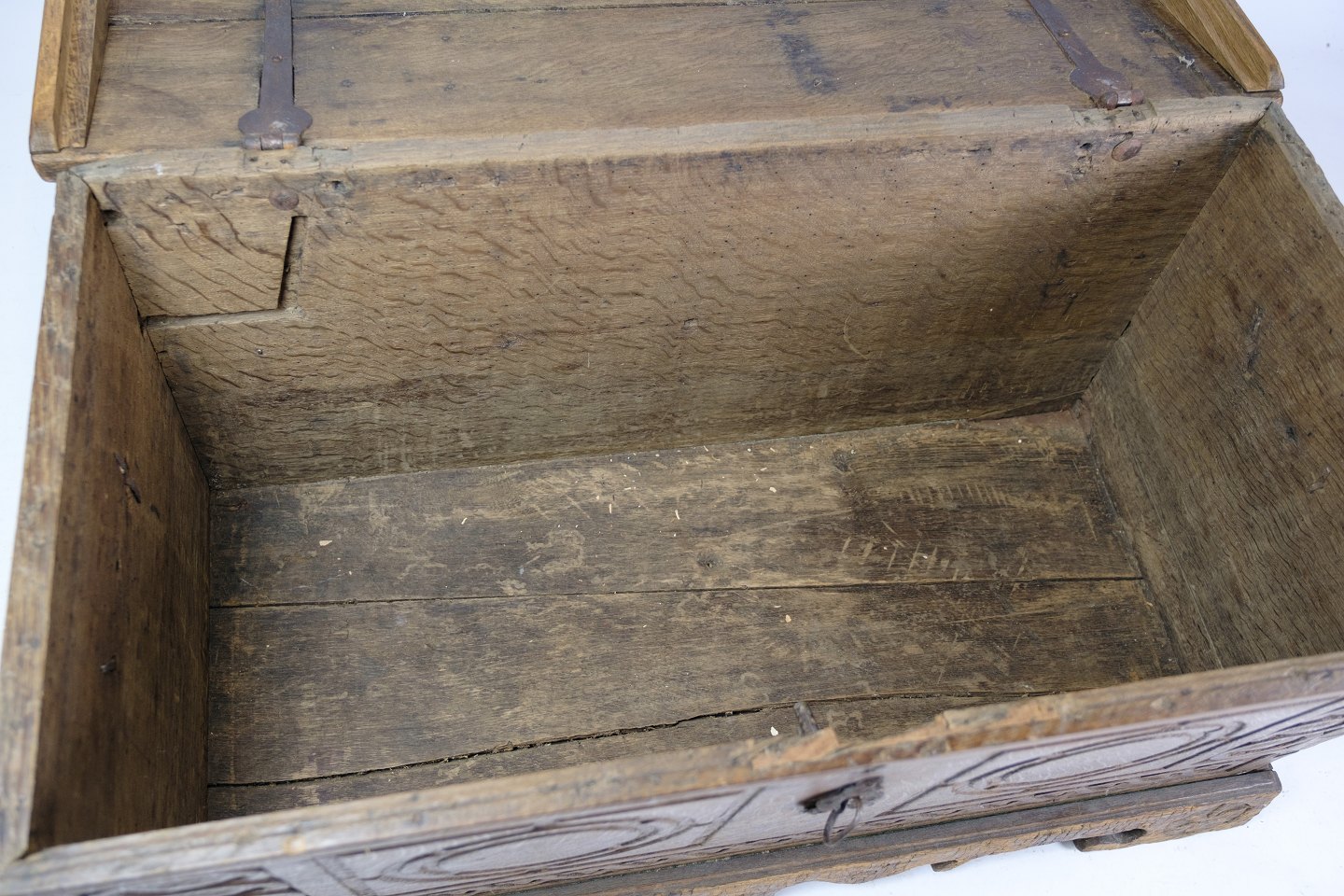 SolgtSønderjysk egetræs kiste med udskæringer fra omkring år 1760'erne. Sjælden størrelse i flot stand.