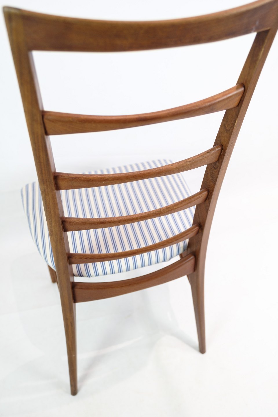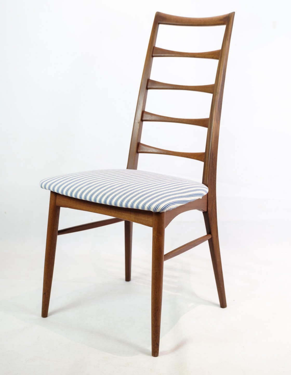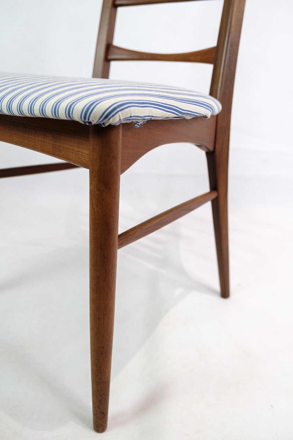 Set of four chairs, model "Lis", designed by Niels Koefoed in teak from around the 1960s. The chairs are upholstered with nice striped fabric.