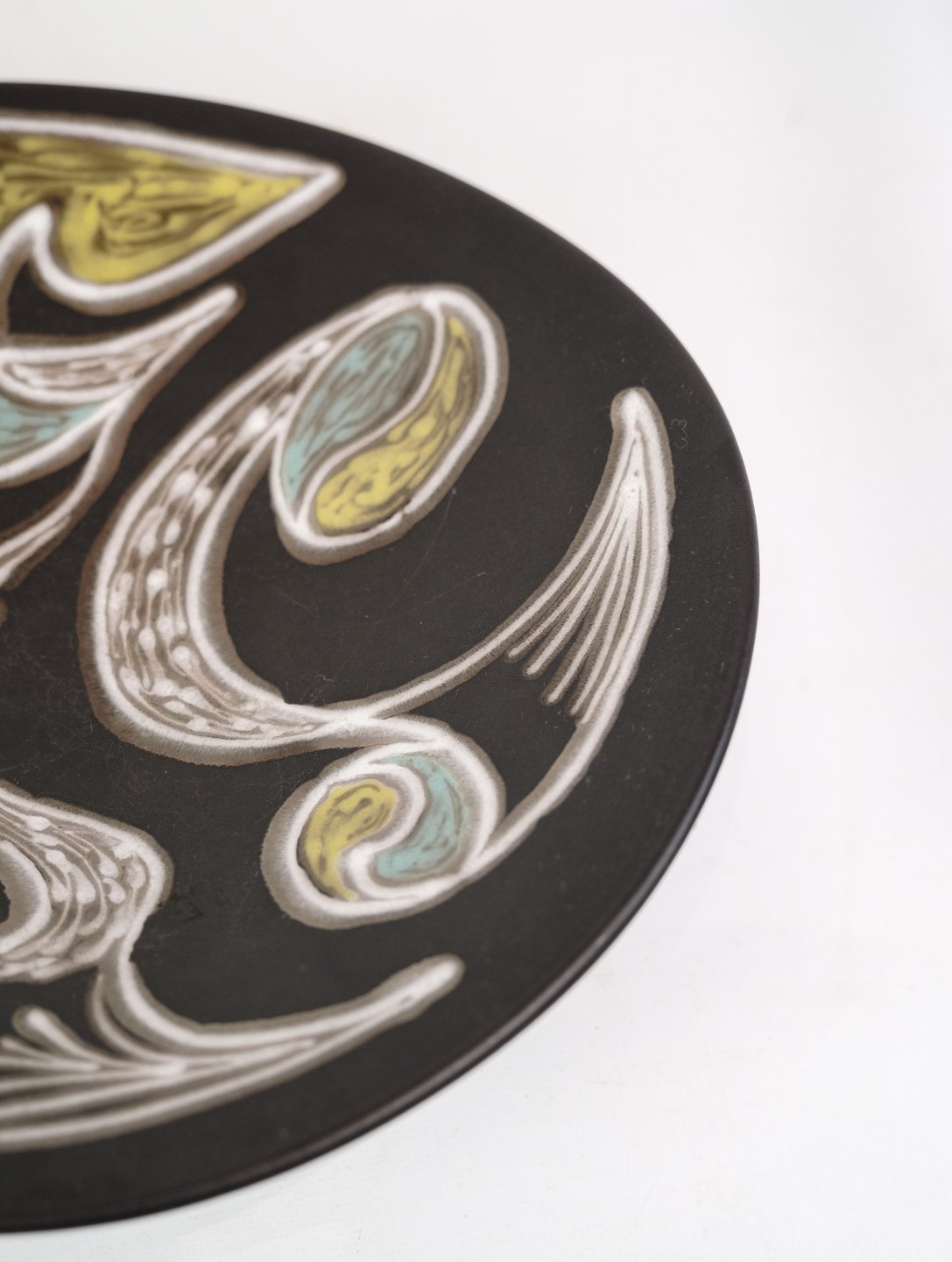 Large dish on foot from Søholm ceramics designed by Holm Sørensen in the 1950s. It has subsequently been decorated by Svend Aage Jensen with the colors white, yellow and light blue.