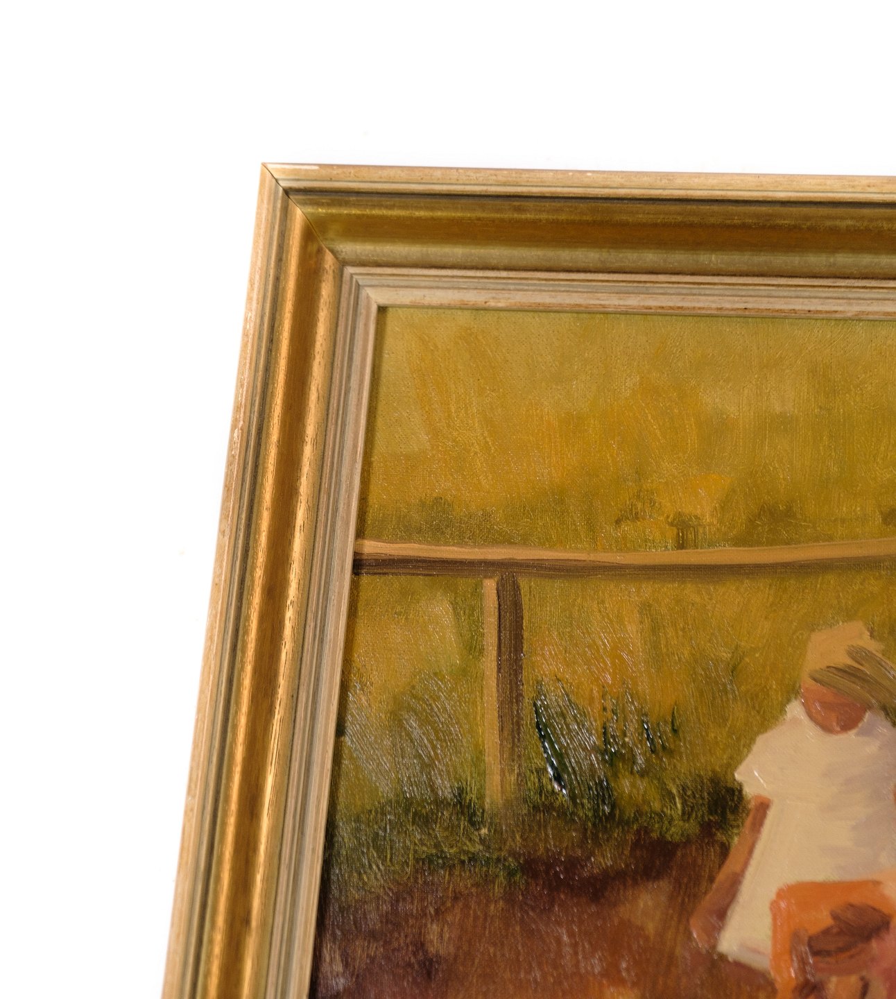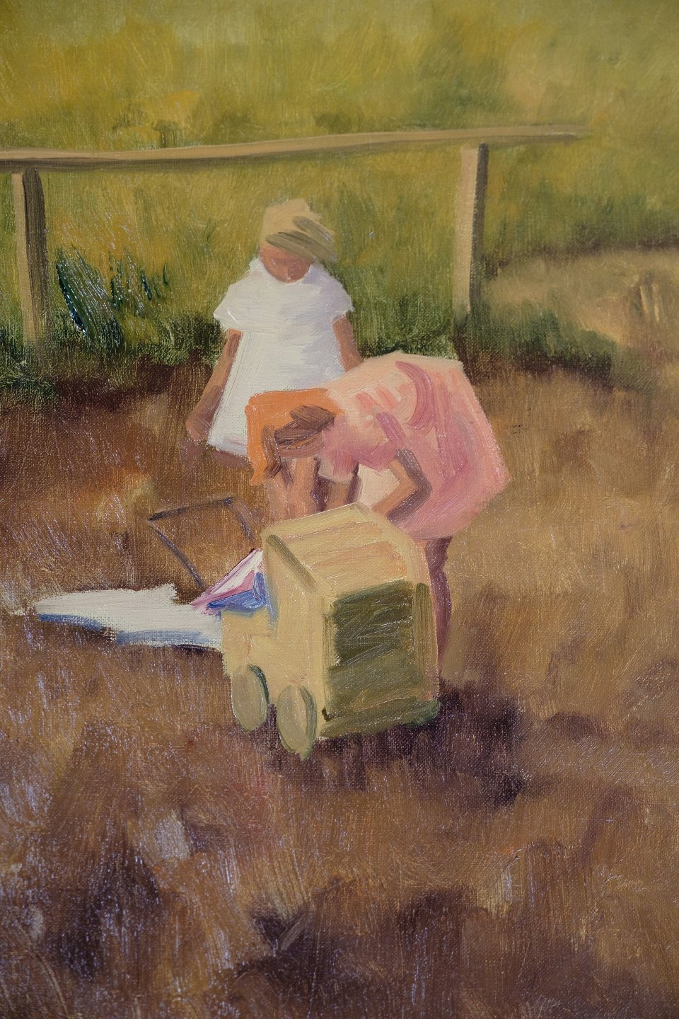 Oil painting on canvas with a motif of children in prams from around the 1940s. Painted by Daniel Bernhardt in The Road.