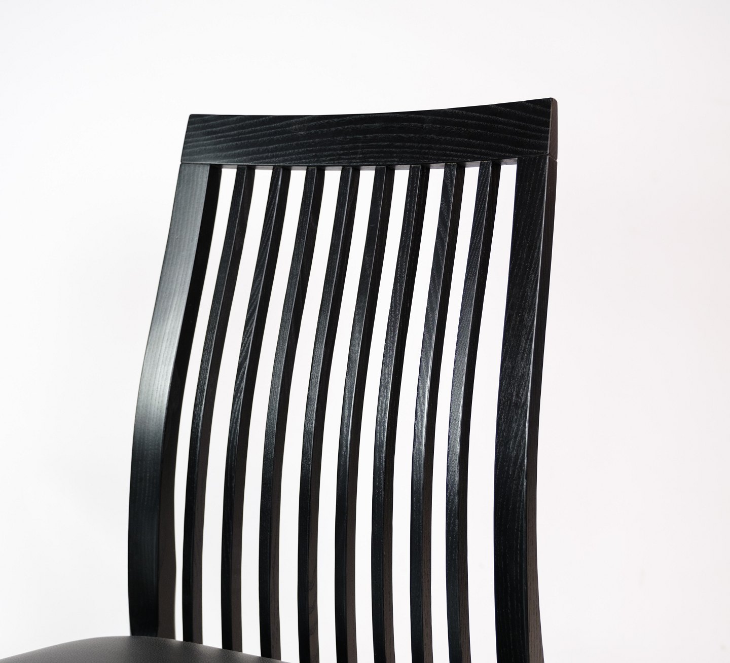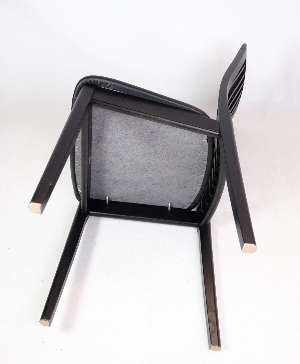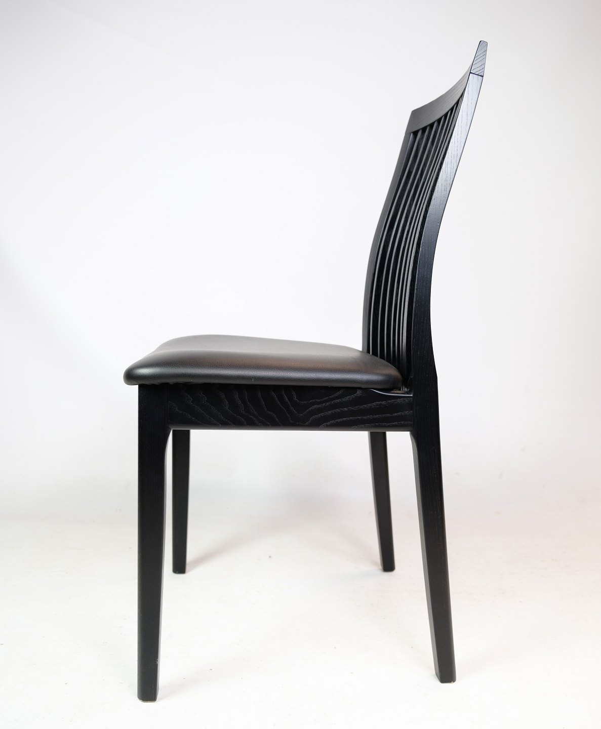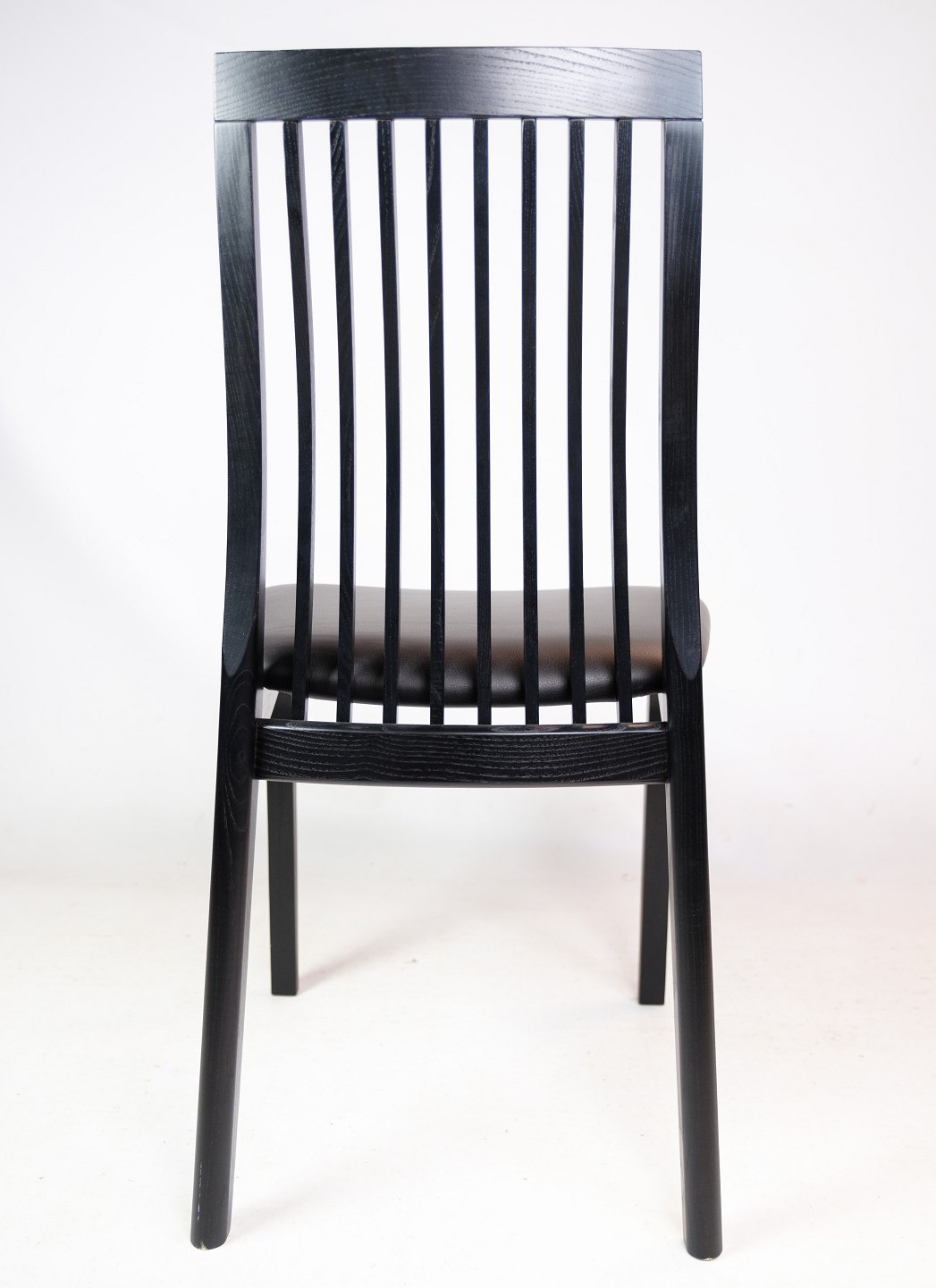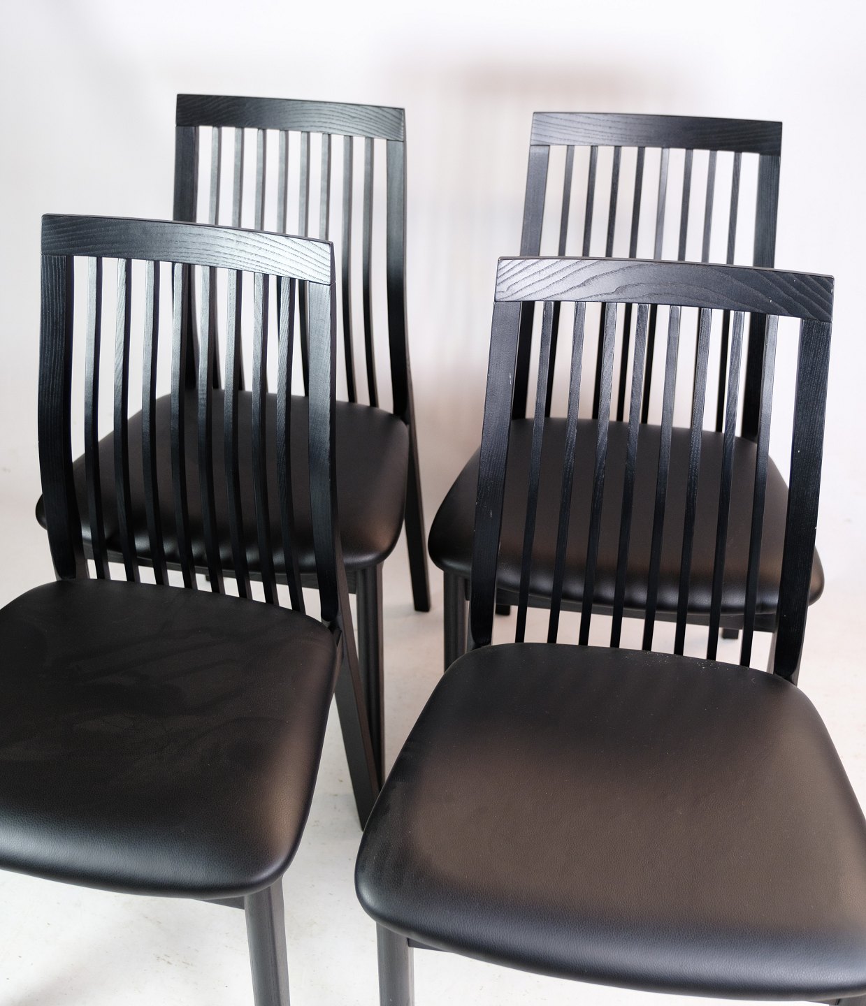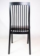 SolgtSæt af 4 spisestuestole, model 712, i sort bejdset ask fremstillet af K. Høffer Larsen A/S. Mellemhøj spisestuestol, med lodrette pinde i ryggen, der giver god siddekomfort.