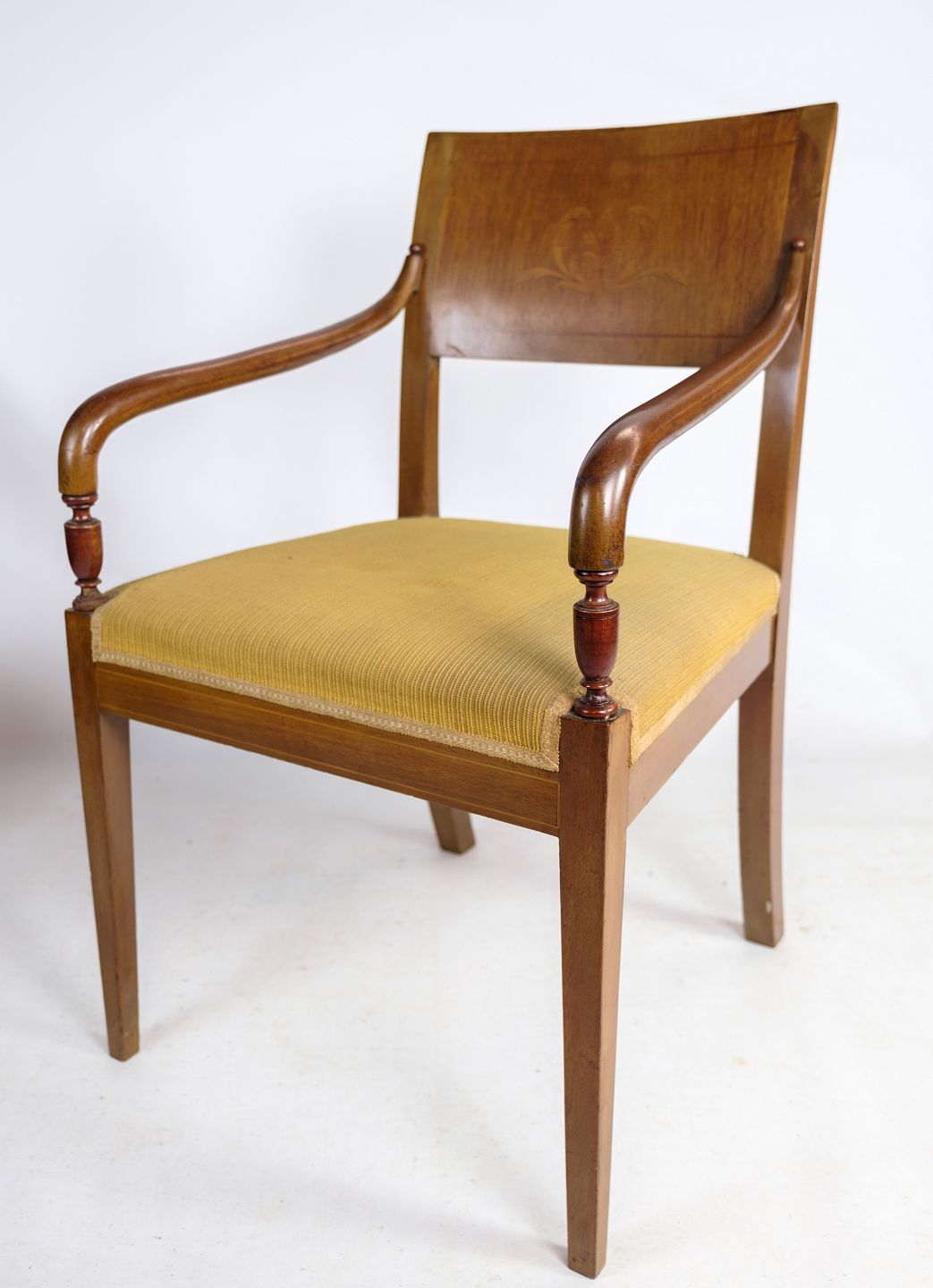 Et par armstole i håndpoleret mahogni af dansk empire stil med intarsia i ryggen af stolen fra omkring 1920'erne.