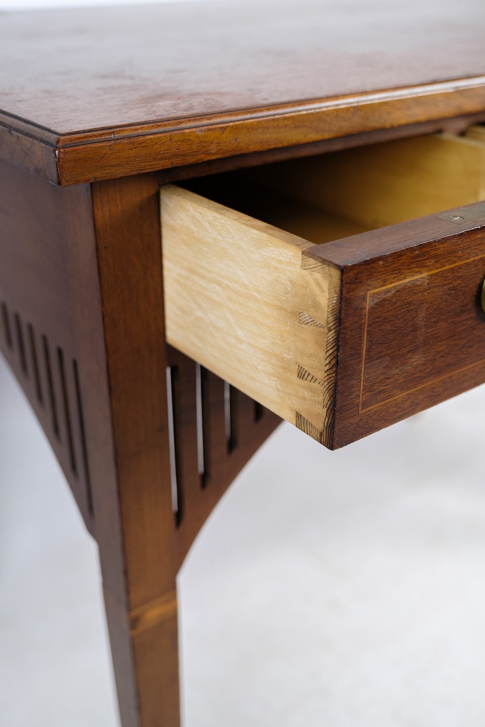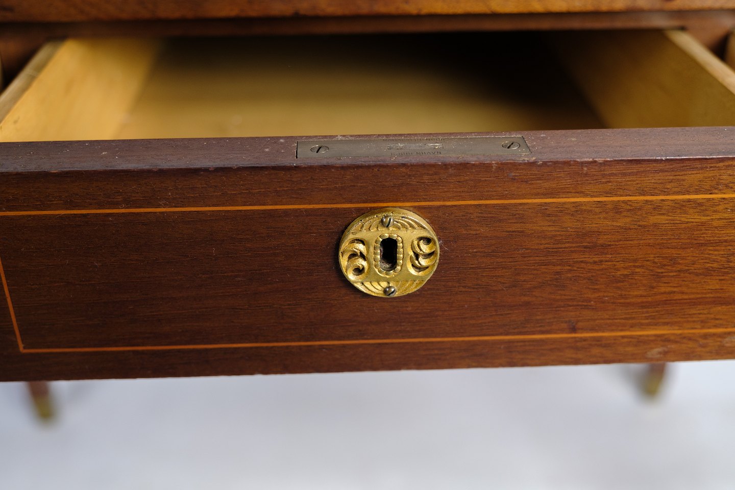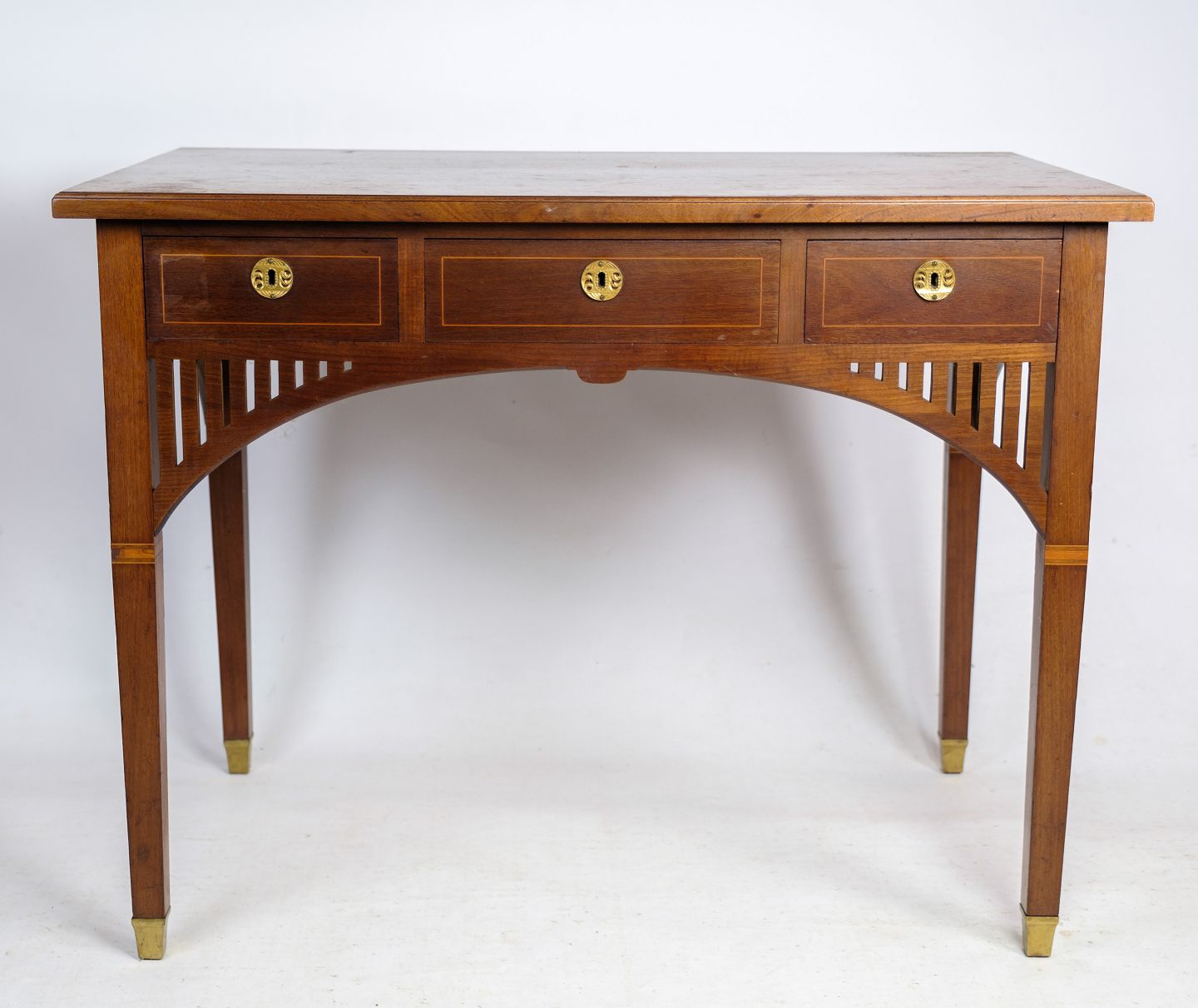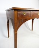 SolgtLille dame skrivebord i mahogni med udskæringer og dekoreret med messing nøglehuller, samt intarsia rundt på skuffen fra omkring 1920'erne.