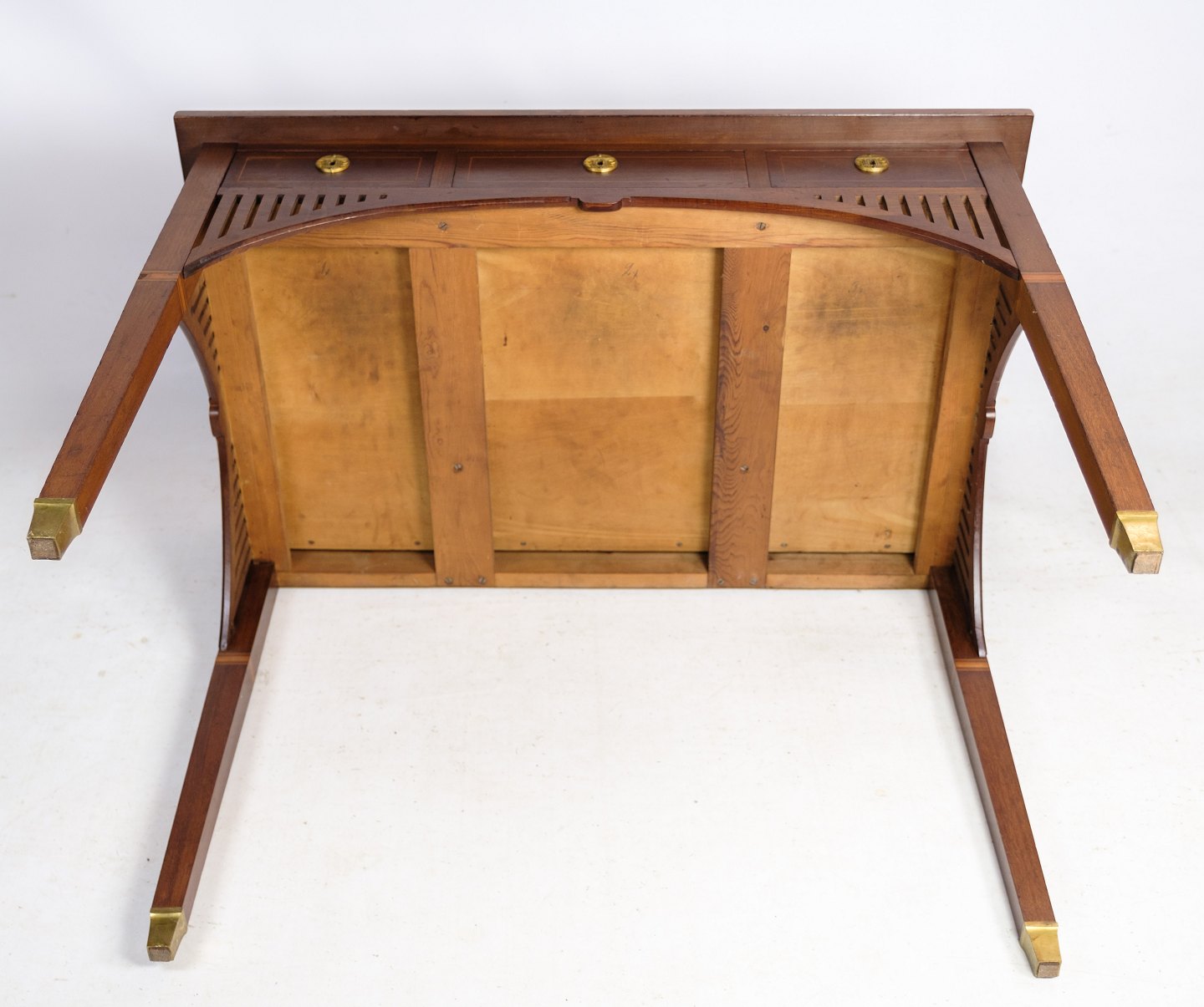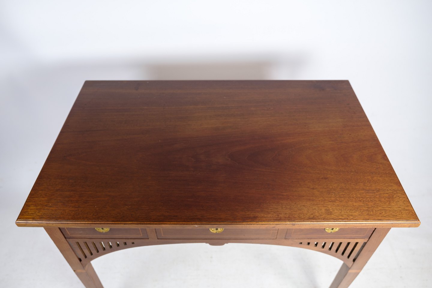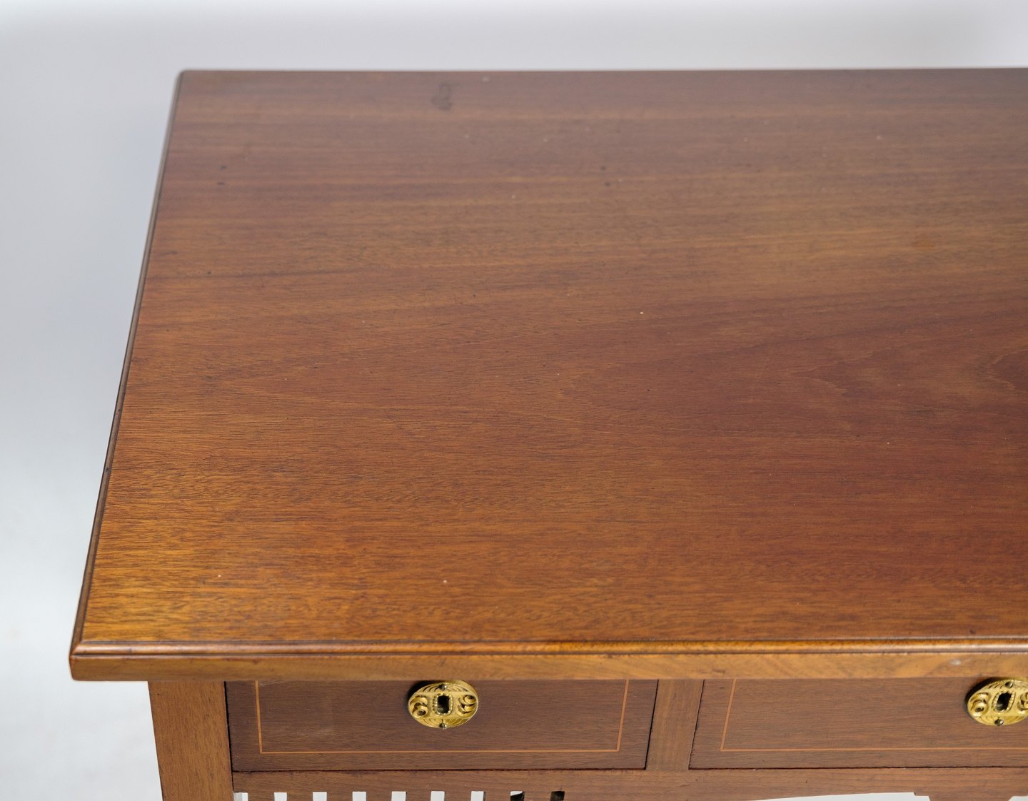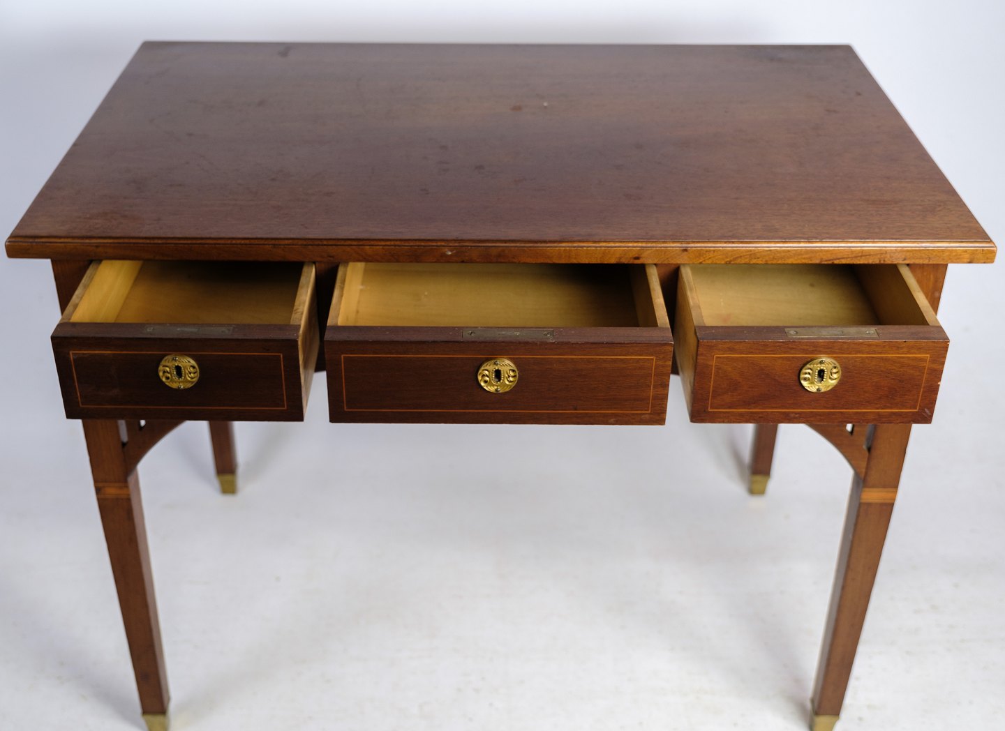SolgtLille dame skrivebord i mahogni med udskæringer og dekoreret med messing nøglehuller, samt intarsia rundt på skuffen fra omkring 1920'erne.