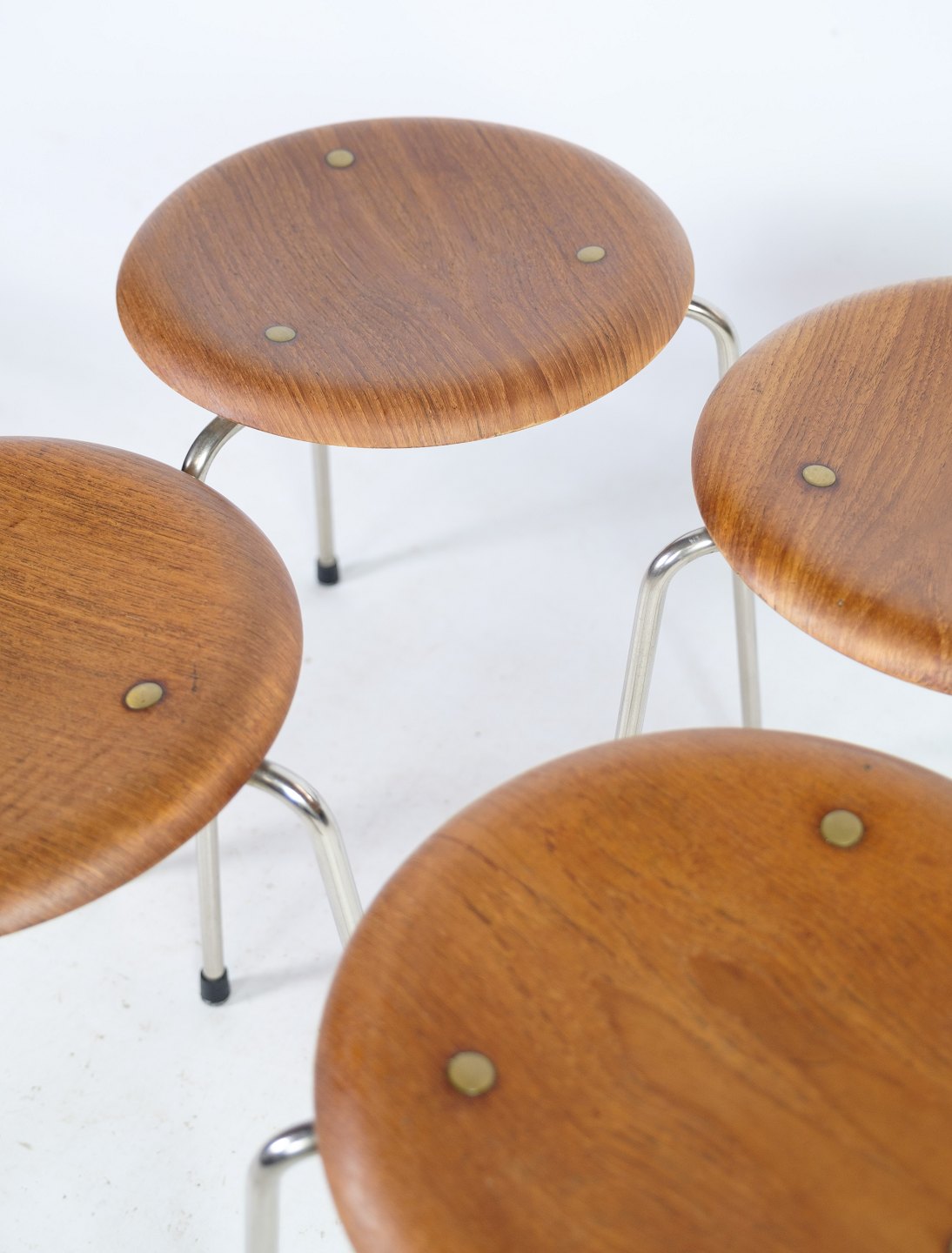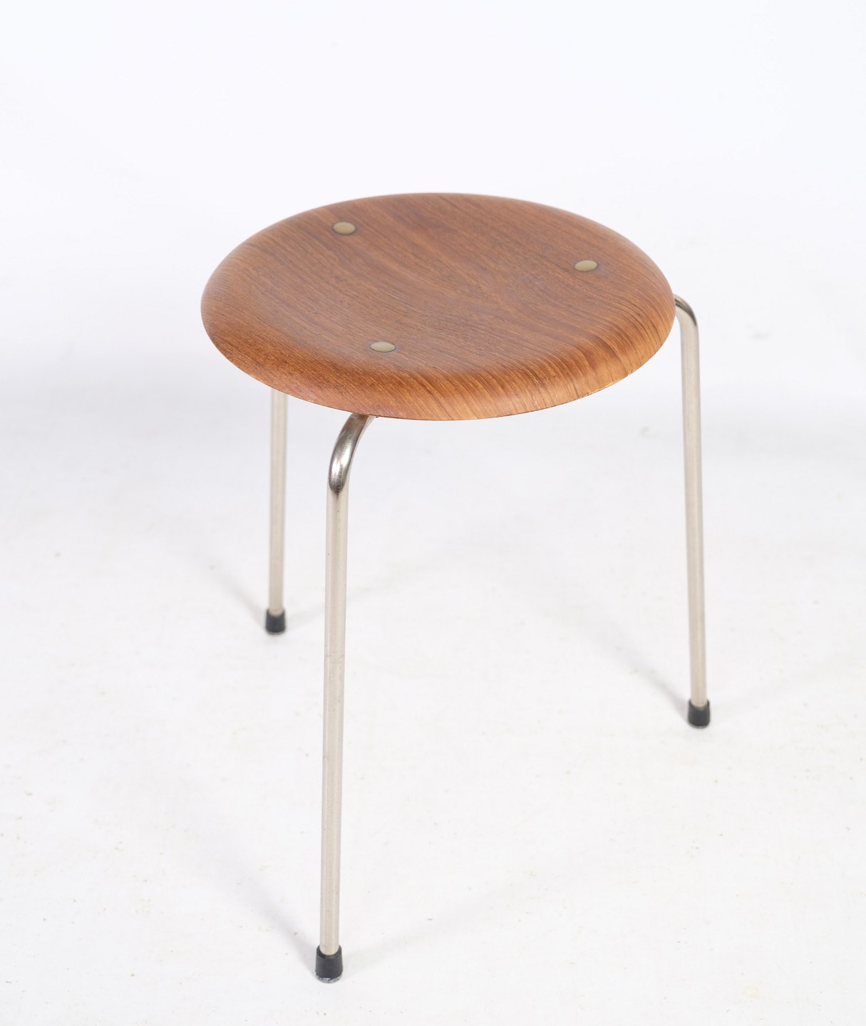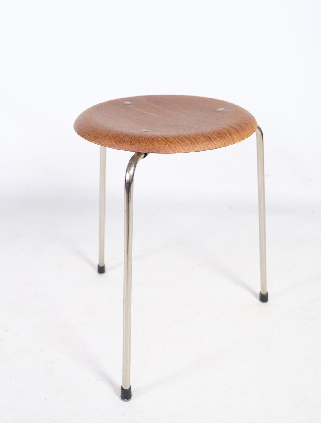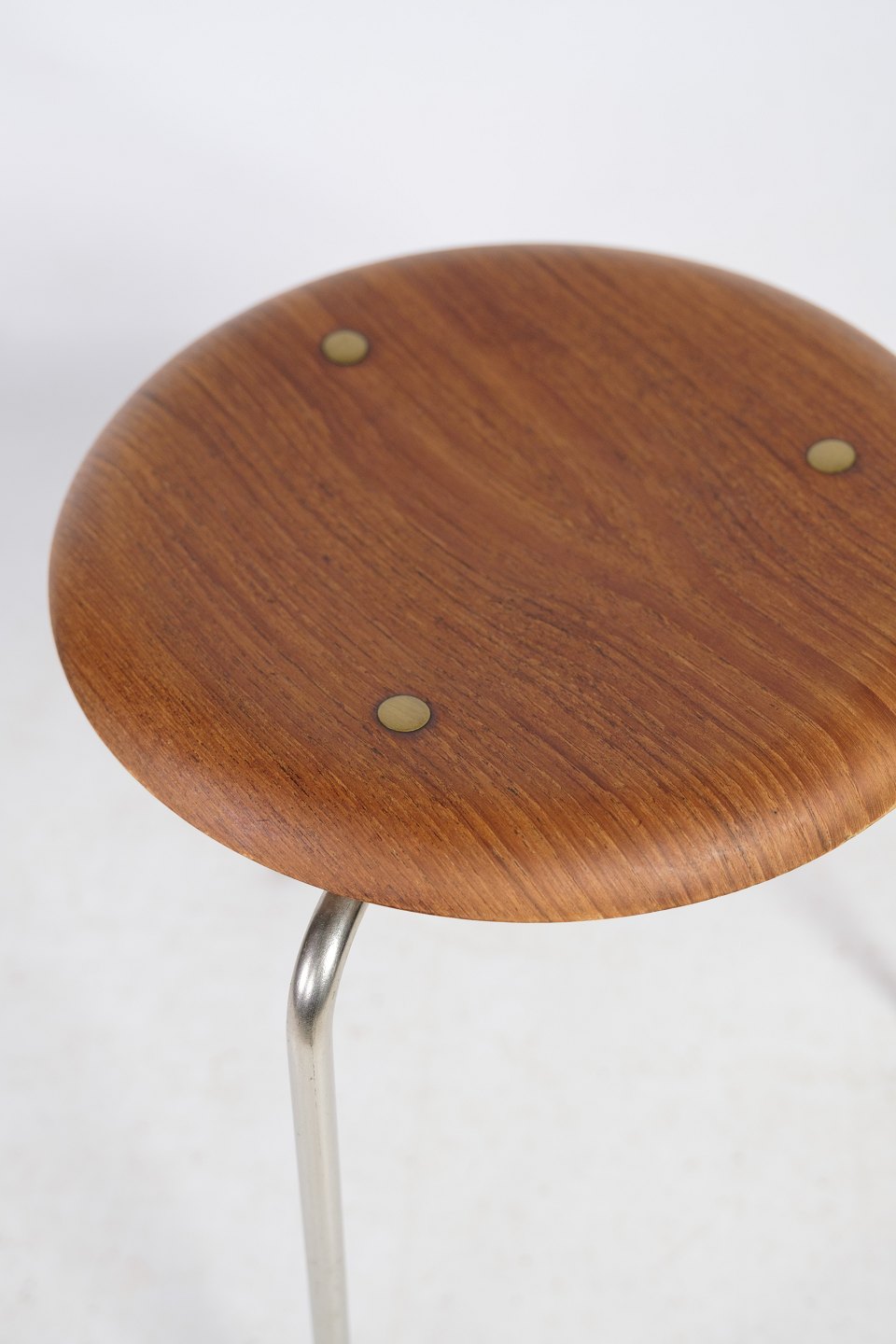 Taburettens ramme er lavet af forkromet metal, som giver den en slank og moderne udstråling. Sædet er lavet af formspændt teakfinér, som er både holdbart og smukt og giver taburetten en varm og naturlig følelse.