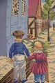 Billedkunst i form af broderi af 2 børn i landsby af røde og blå farver fra omkring 1930'erne