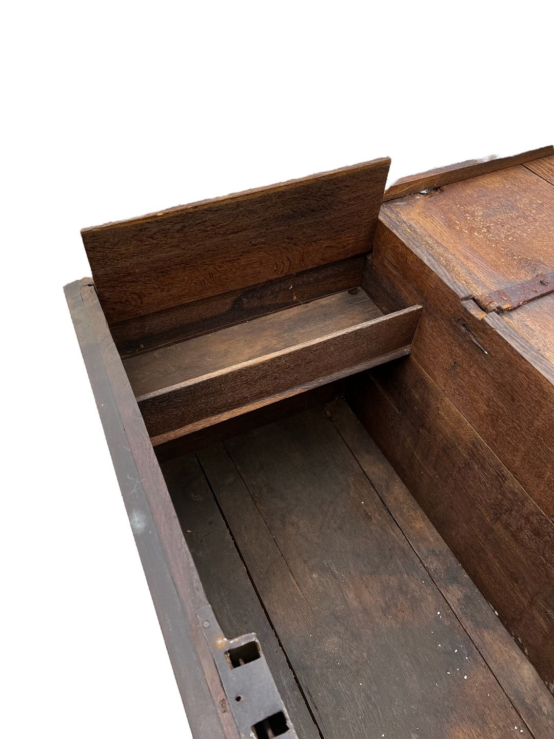 Kiste i egetræ med et fladt låg, samt 3 buede fronter og udskæringer fra år 1760'erne.