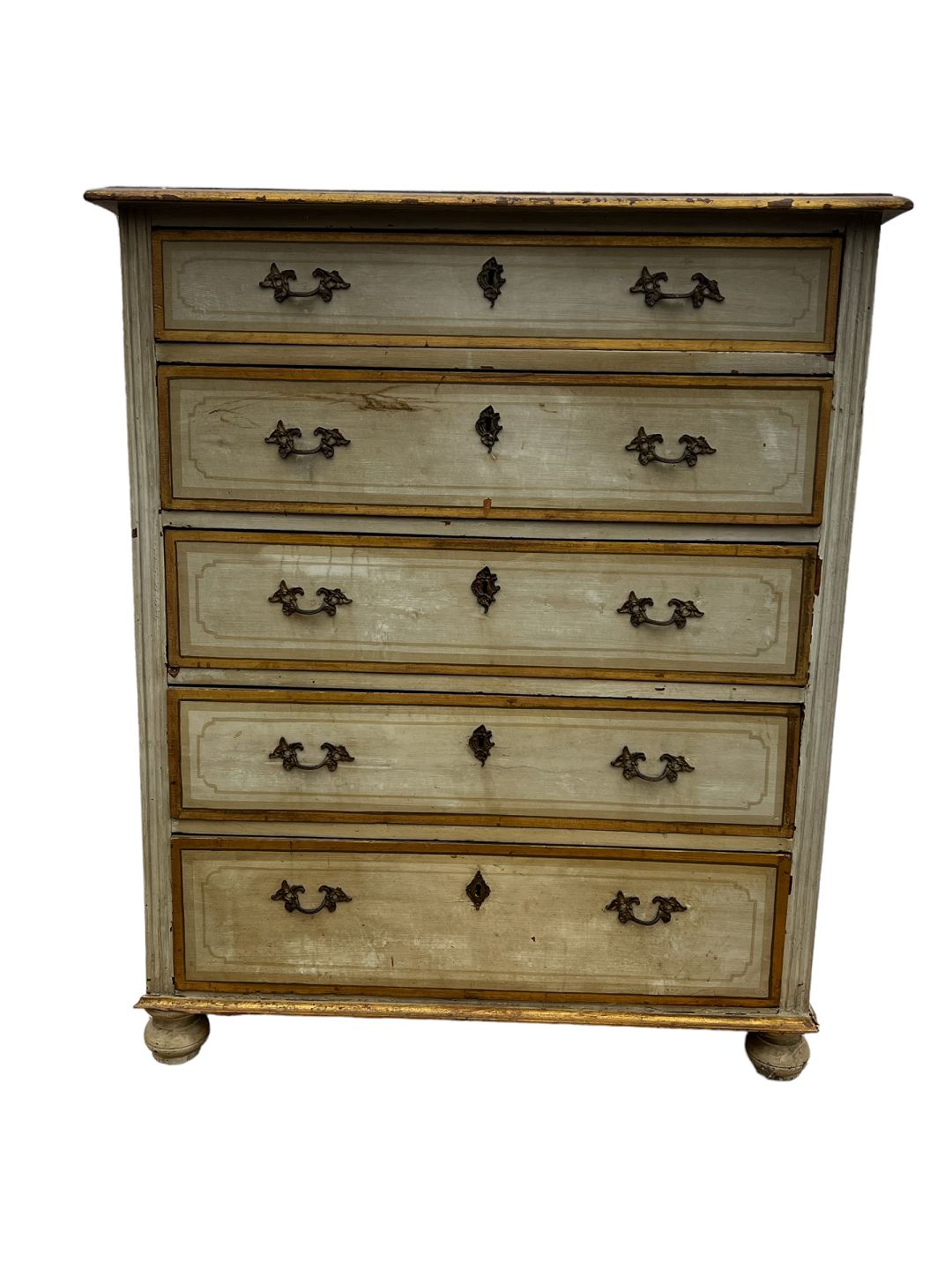Kommode i bemalet træ med patina i lyse farver med udsmykkede håndtag og 5 skuffer fra omkring år 1890'erne.