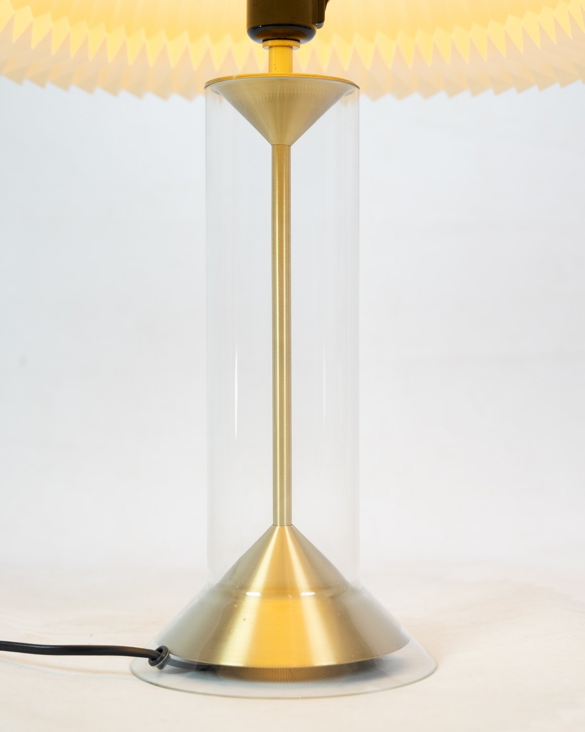 Bordlampe i messing, model 303b, er et smukt design af Aage Petersen for Le Klint, der kombinerer elegance og funktionalitet.