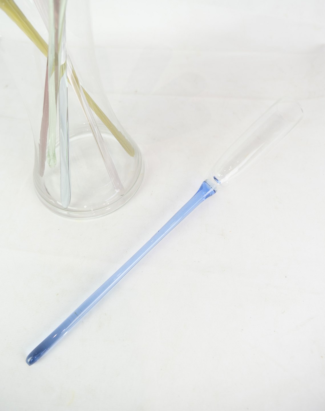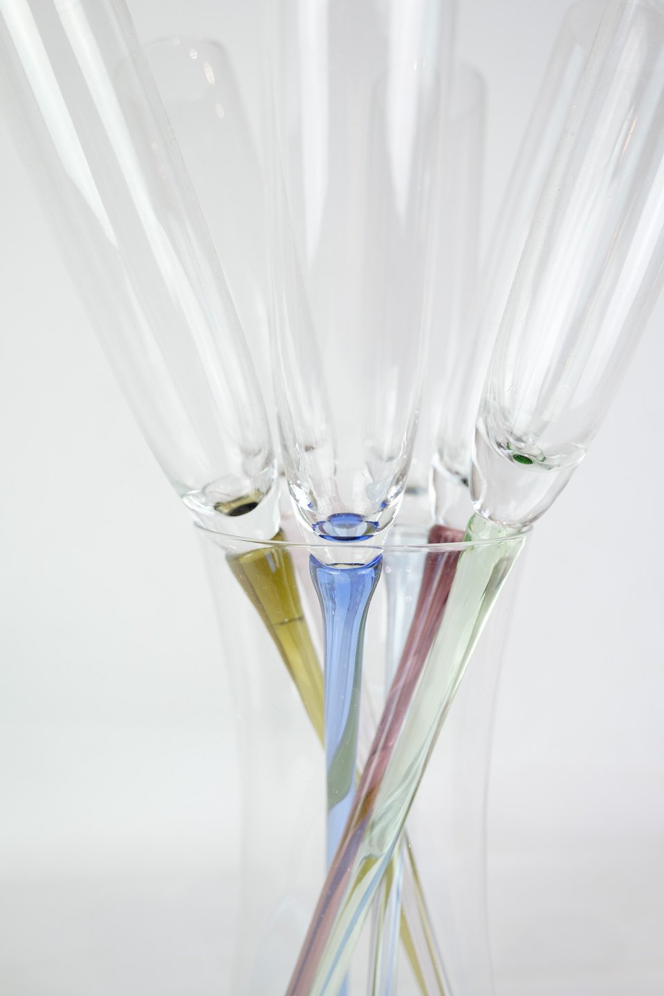 SolgtServerings glas vase med champagne glas på stilk med forskellige farver. Sælges som sæt.
