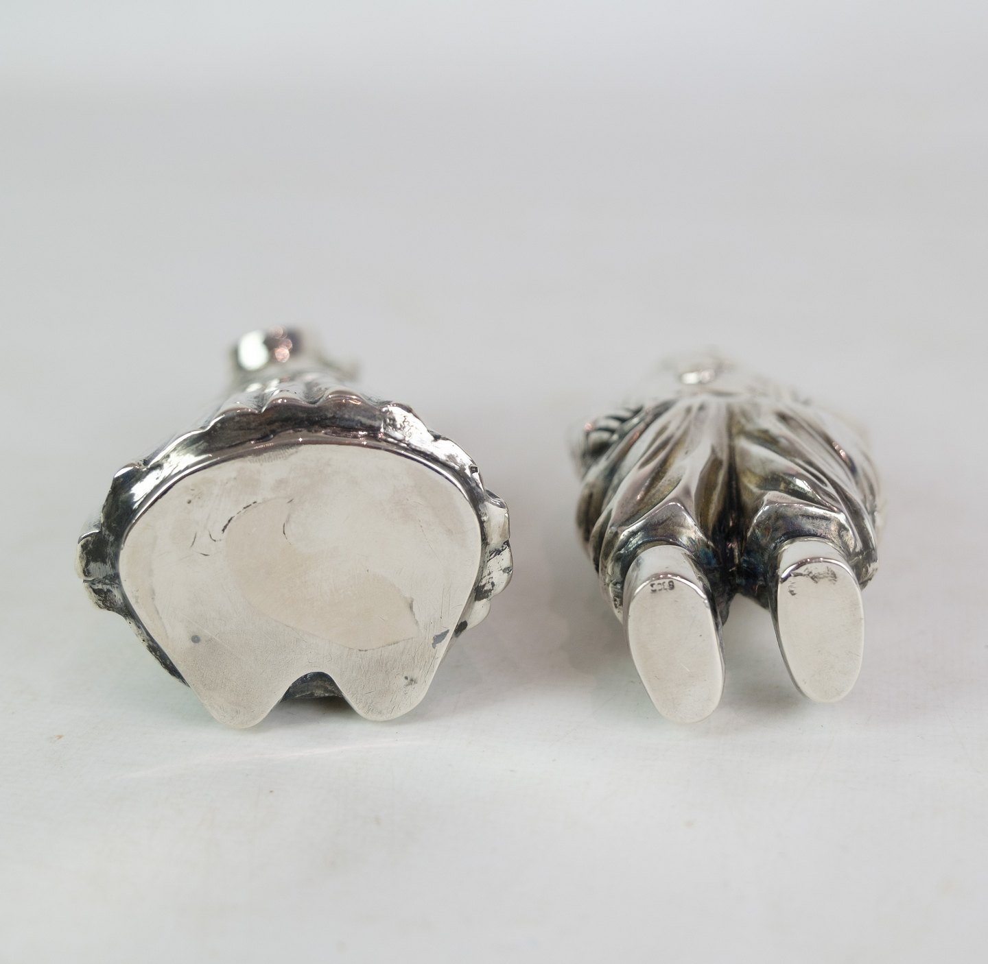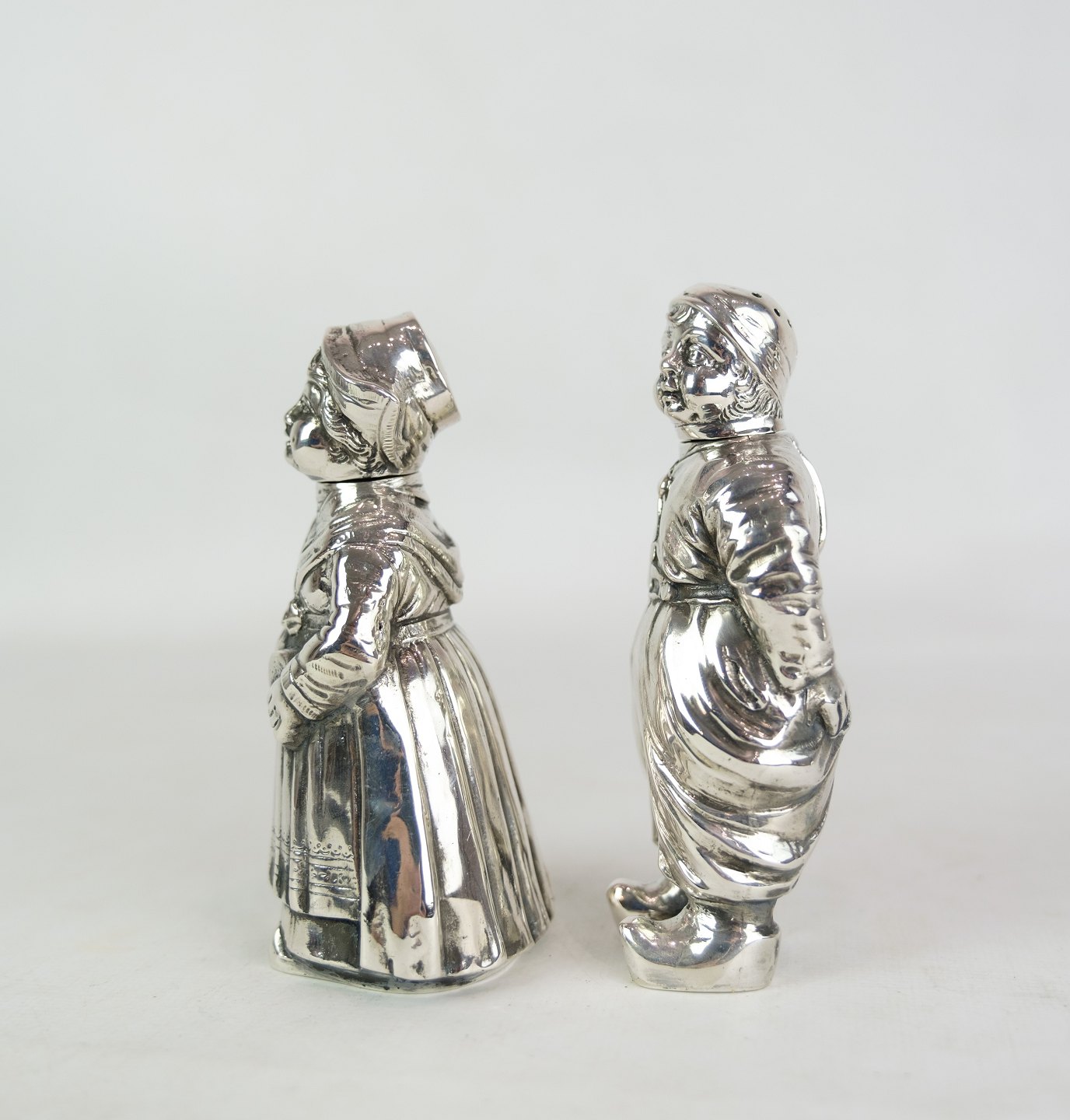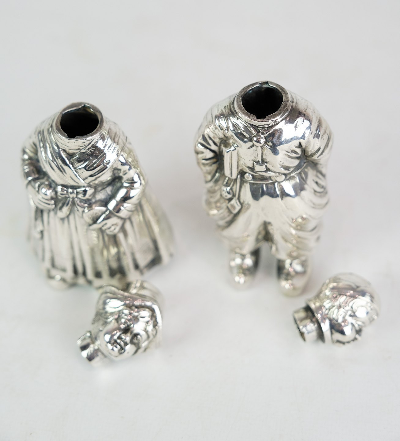 Salt and pepper shaker in silver, stamped 830, designed as a man and a woman. Weight: 325g