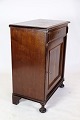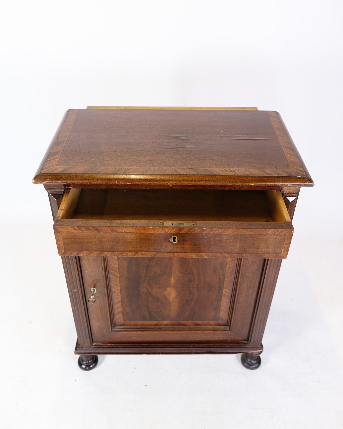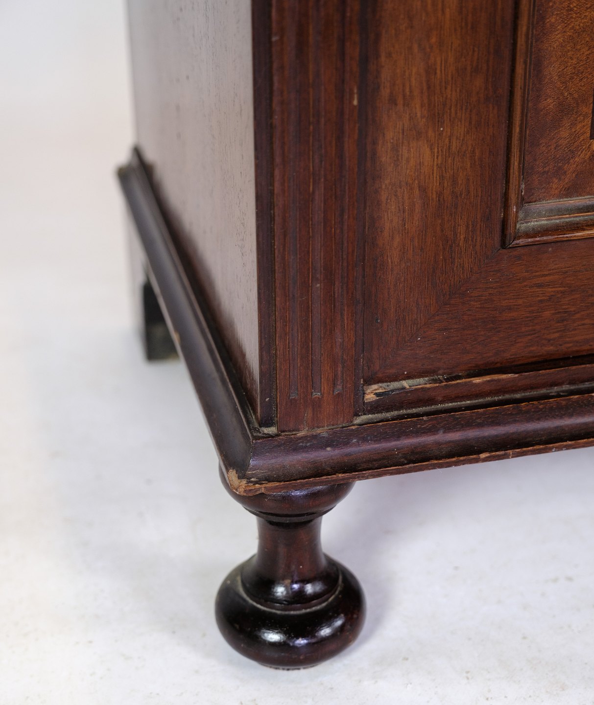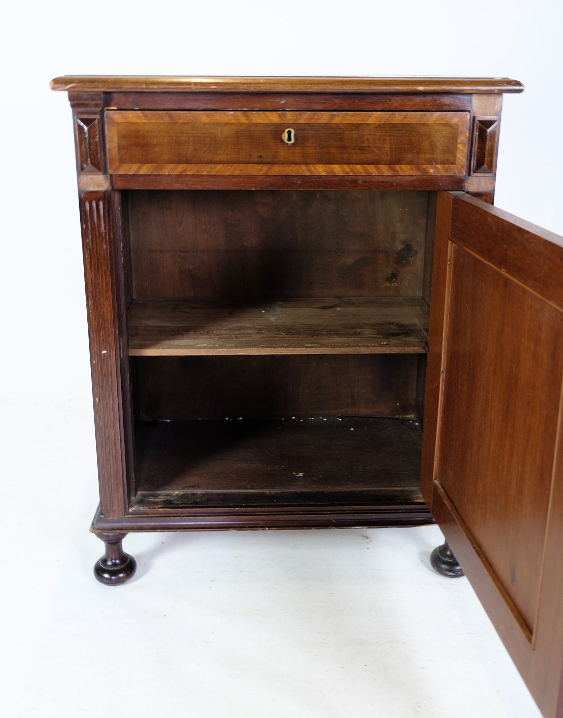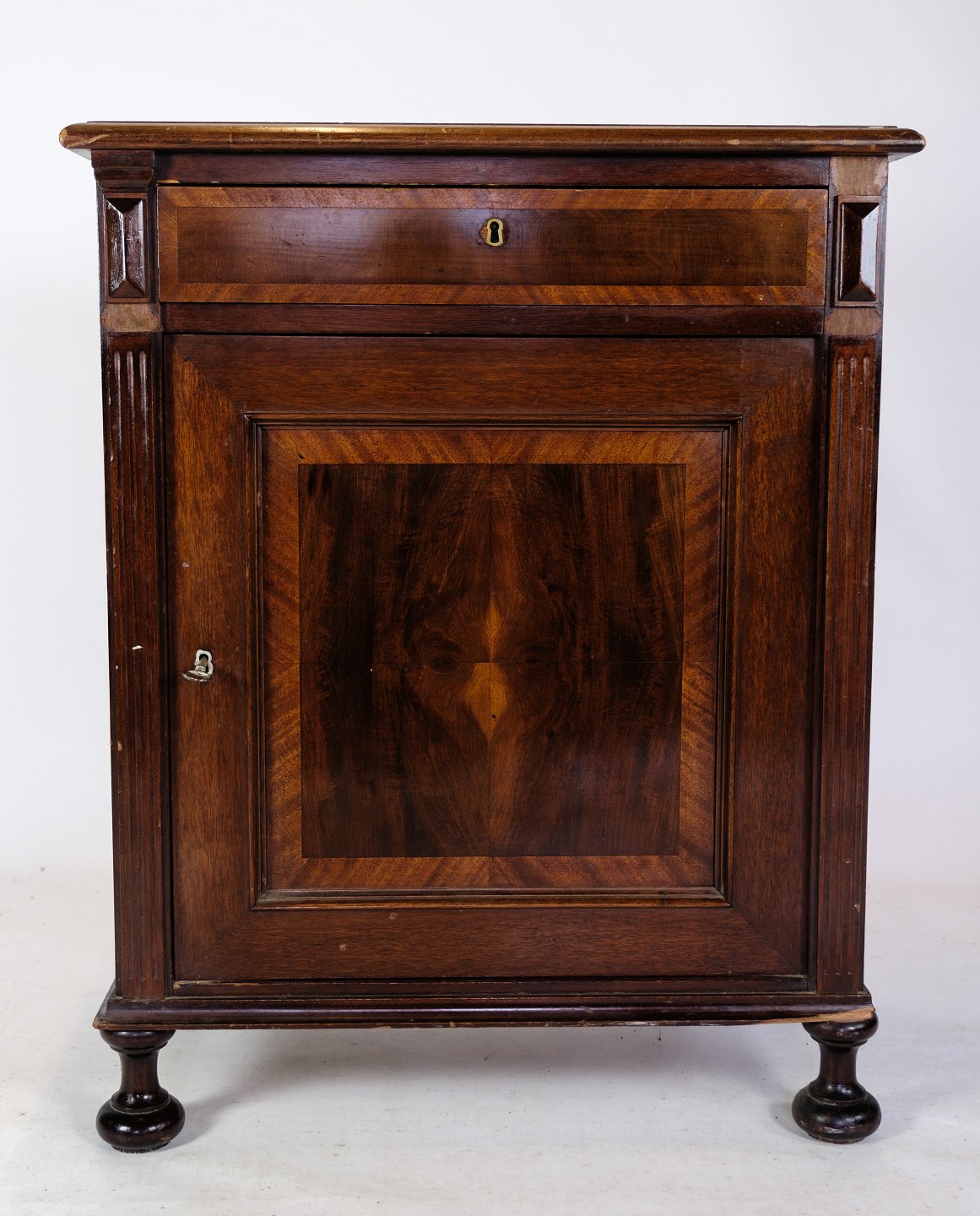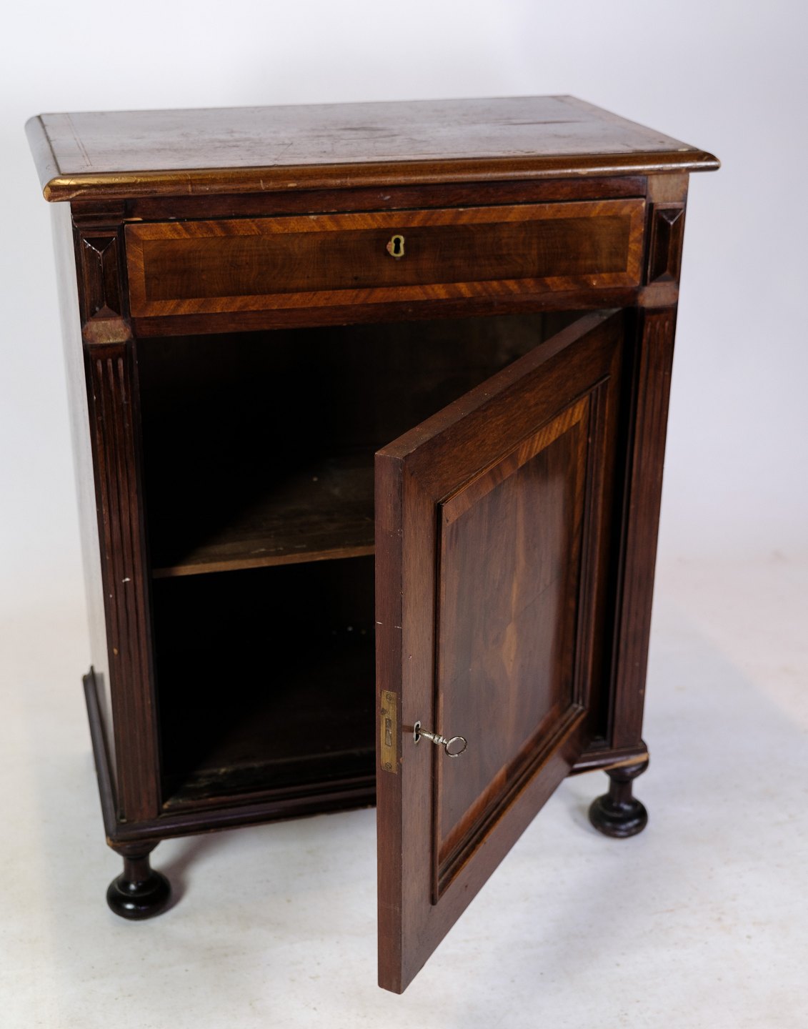 SoldMahogany console with inlaid walnut wood and round legs from around the 1880s.