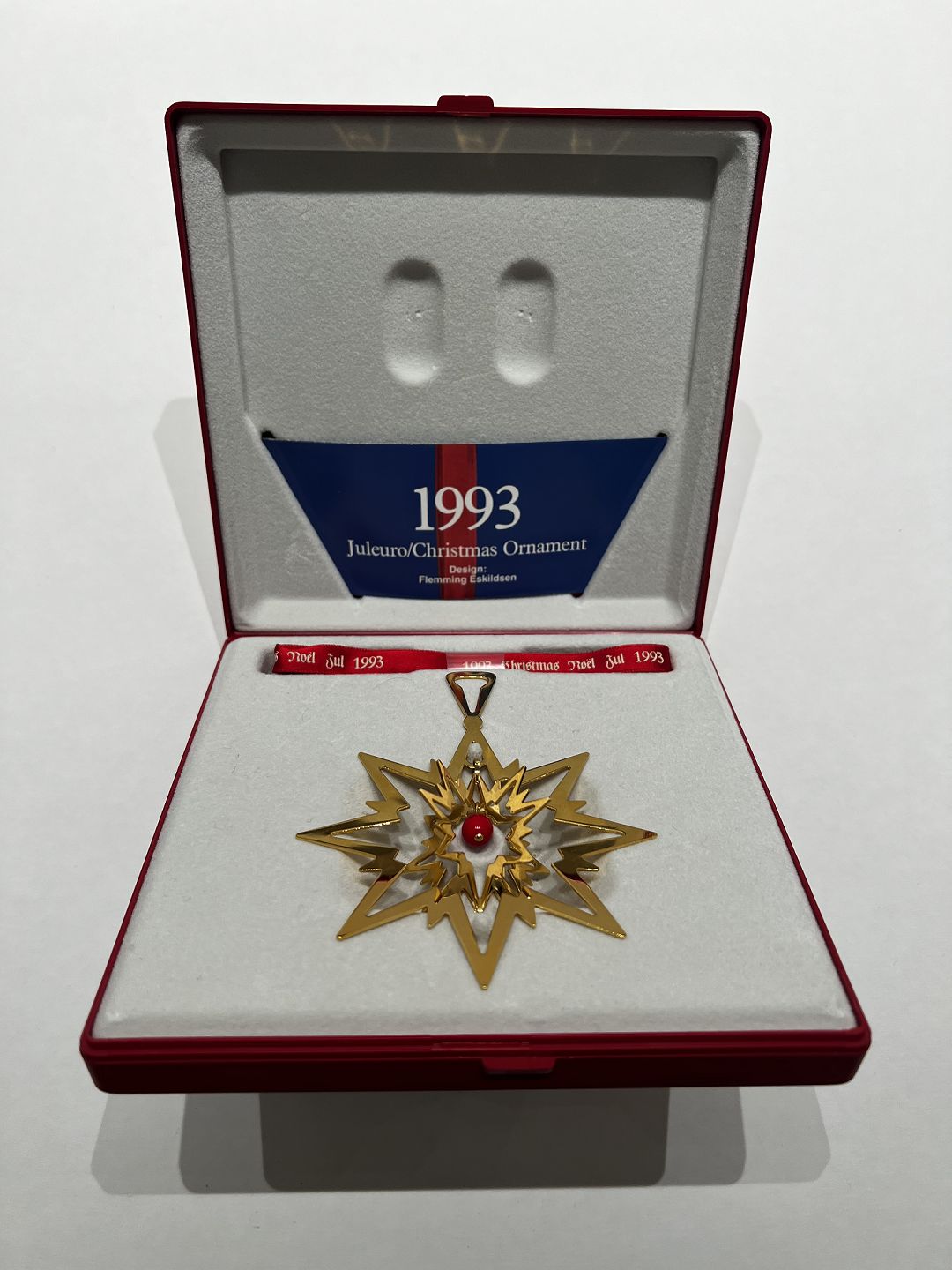 Georg Jensens juleuro fra 1993 med titlen "Julestjerne" er et smukt stykke designet af Flemming Eskildsen. Uret er lavet af forgyldt messing og måler 9 cm i højden.