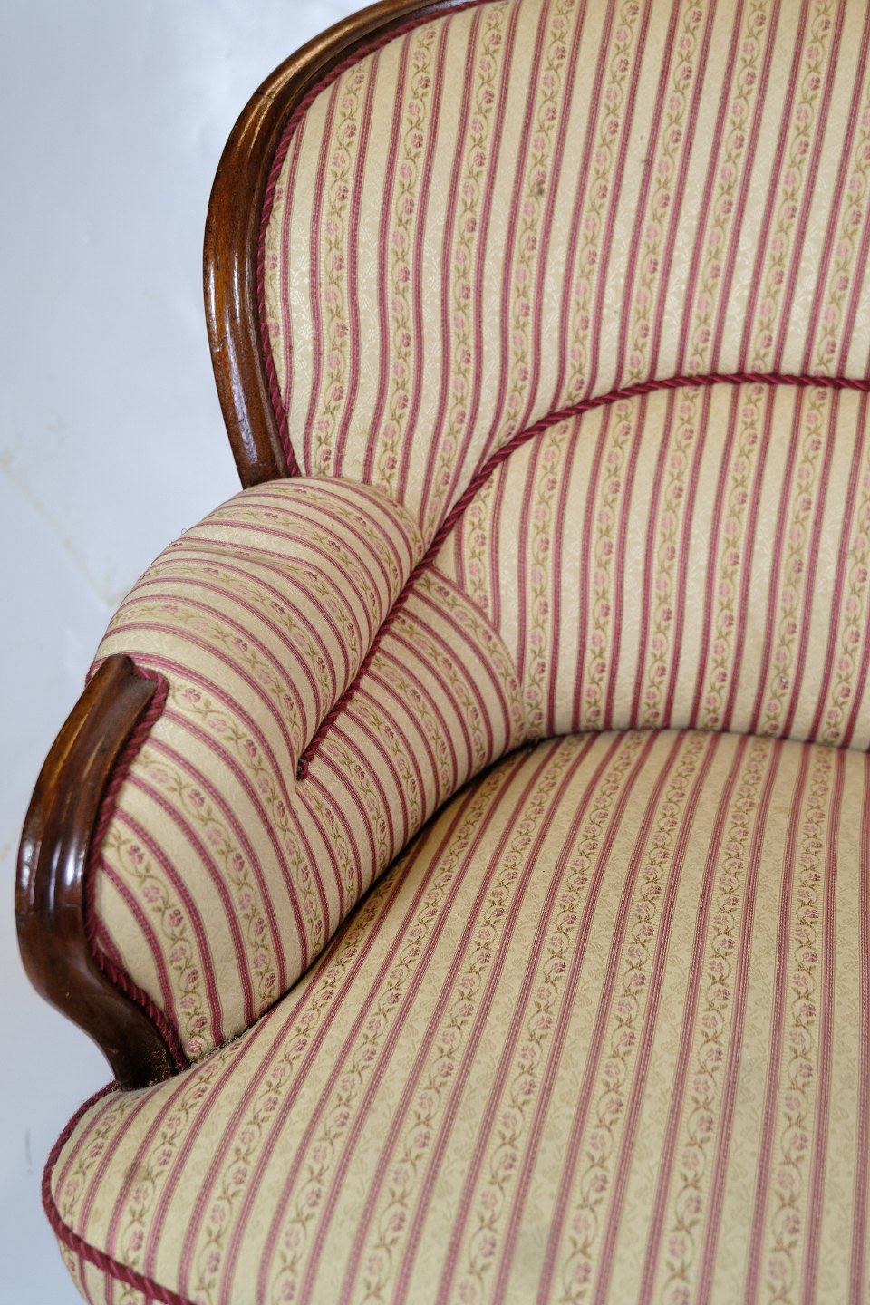 SoldThis antique two-seater sofa from approx. 1890 is a fine example of period craftsmanship and elegance. Made of mahogany wood, the sofa exudes a timeless charm and durability. Upholstered in a beautifully patterned fabric, it adds a touch of elegance and personality to any decor. With its older age, the sofa wears an authentic patina that only adds to its unique appeal. The comfortable seating makes it perfect for relaxing and socializing.