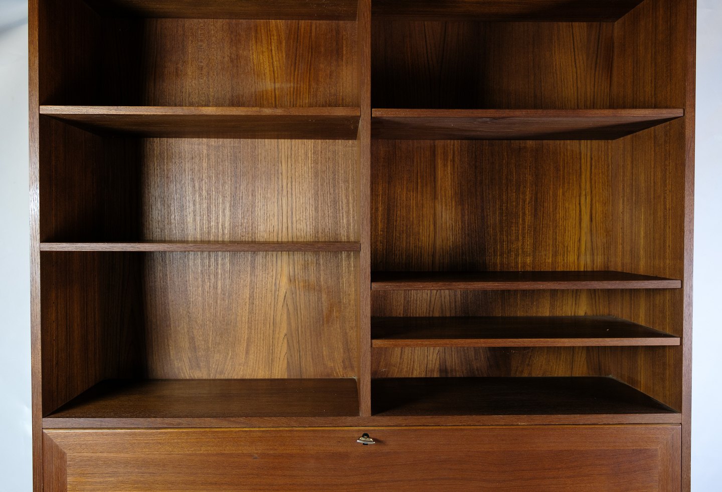 Made of teak and dating from the 1960s, this impressive bookcase with secretary/desk is a masterpiece of functionality and aesthetics. With its beautiful teak wood and characteristic design, this bookcase exudes a timeless elegance and simplicity that is characteristic of Danish design.