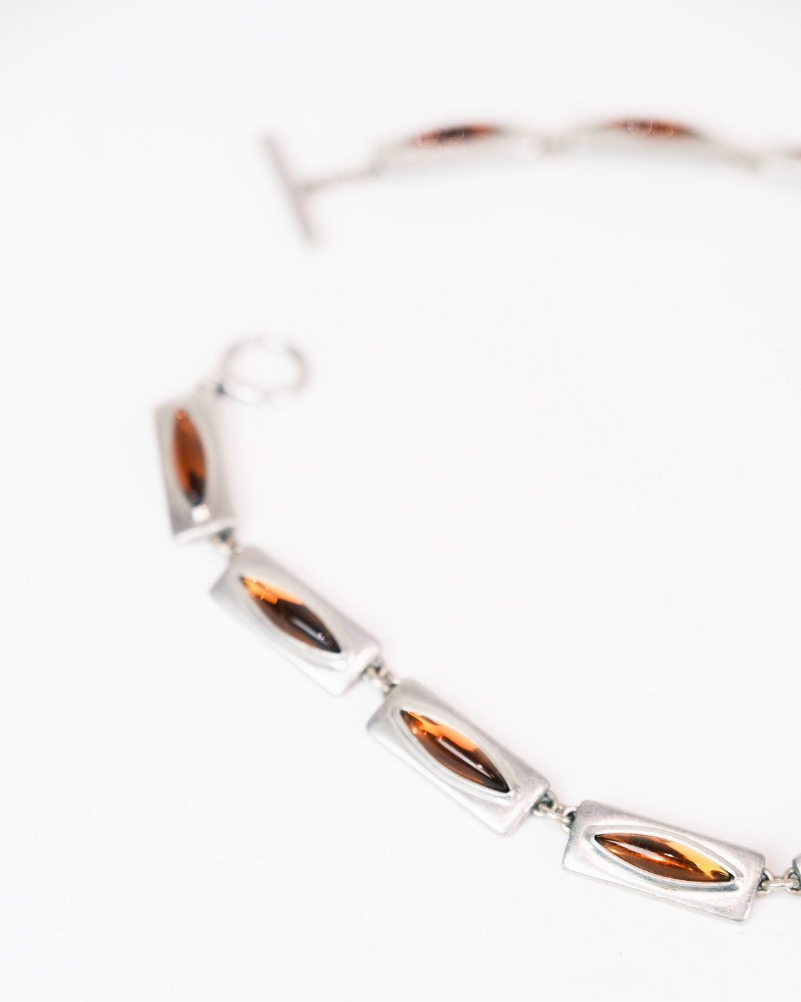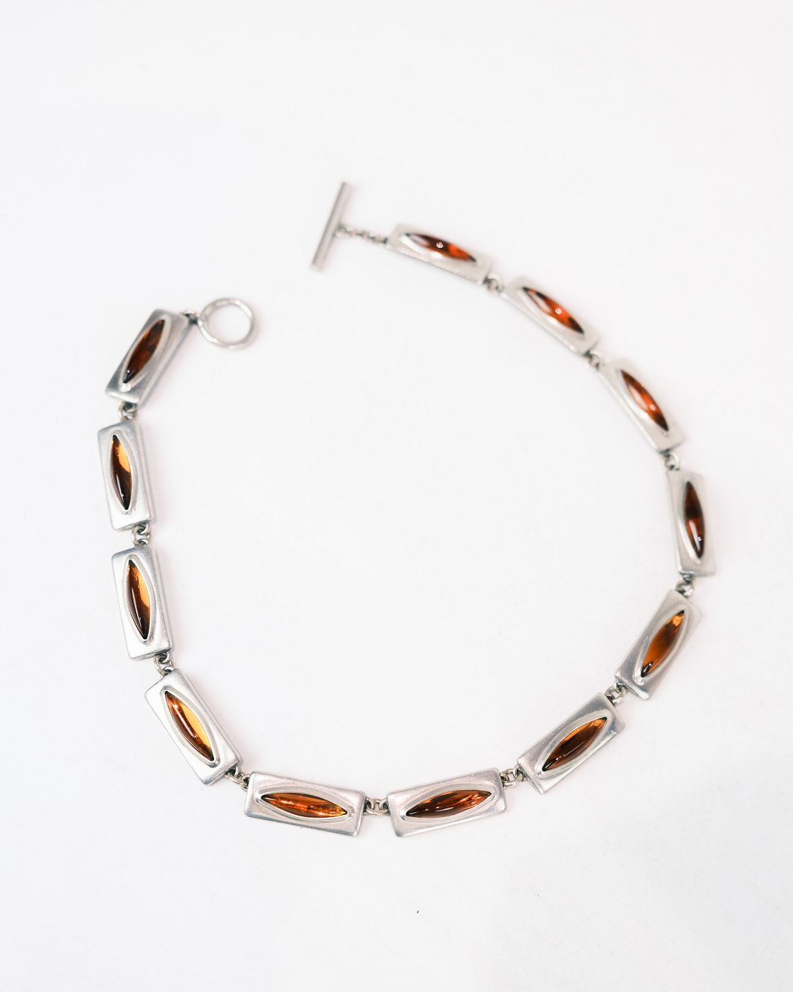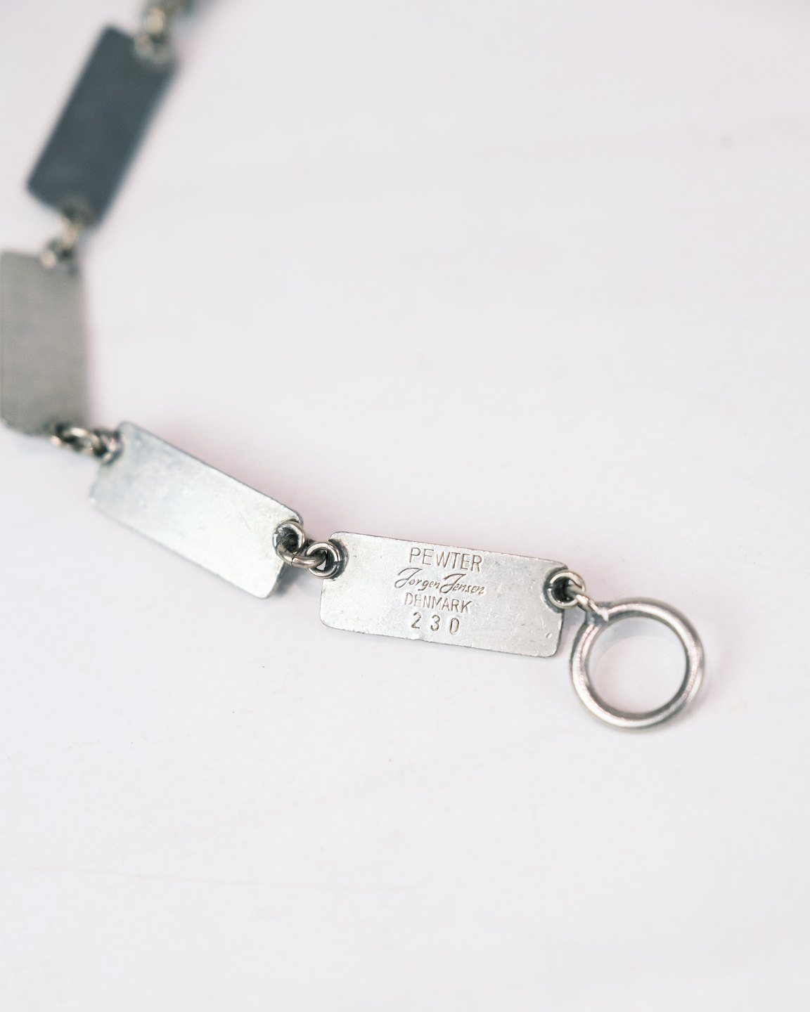 Necklace in tin, decorated with amber, designed by Jørgen Jensen in the 1960s. Jørgen Jensen, known for his work with pewter, created jewelery that combined simplicity and the beauty of nature. This necklace is a timeless example of his design, where the warm amber plays beautifully with the cool tin.