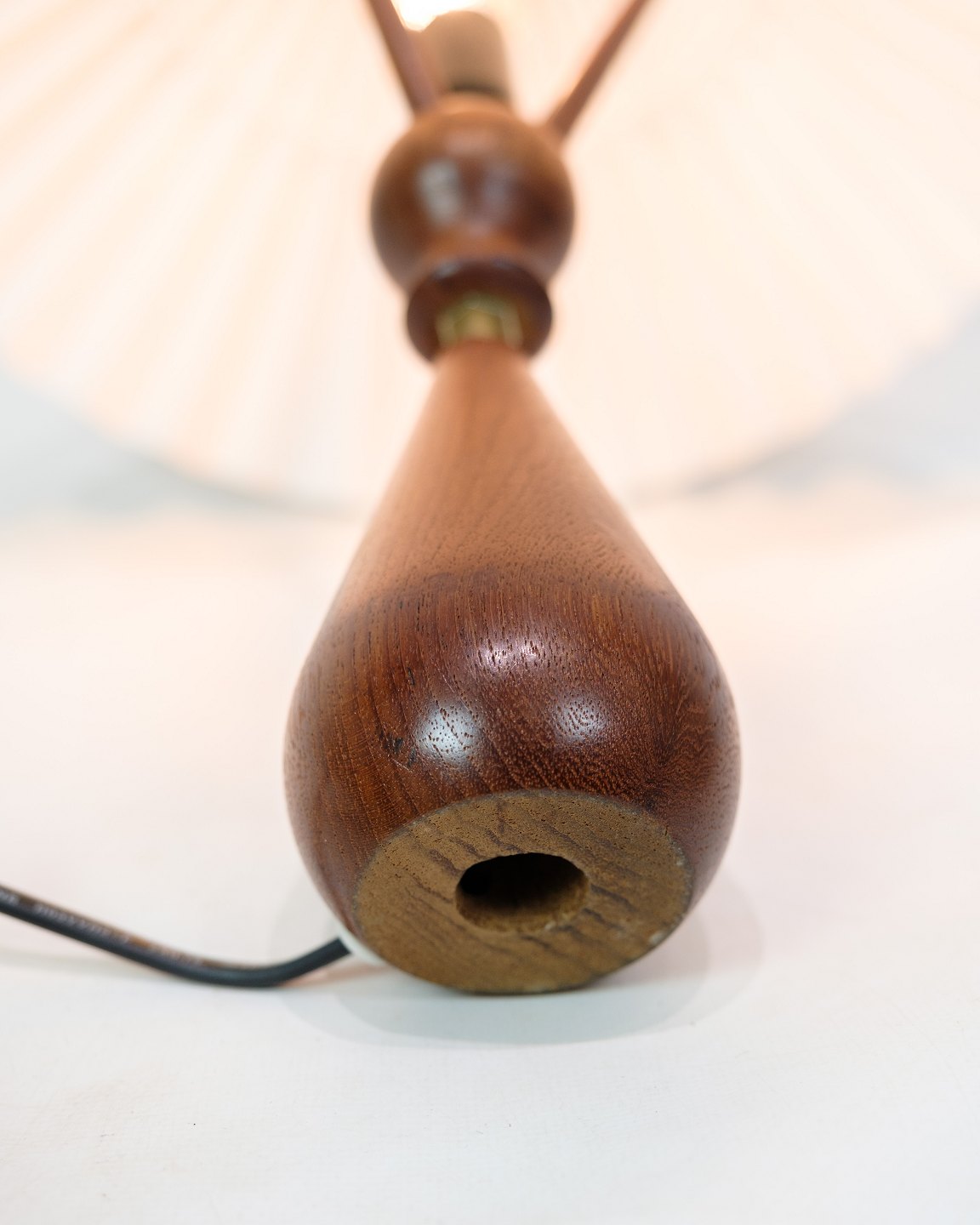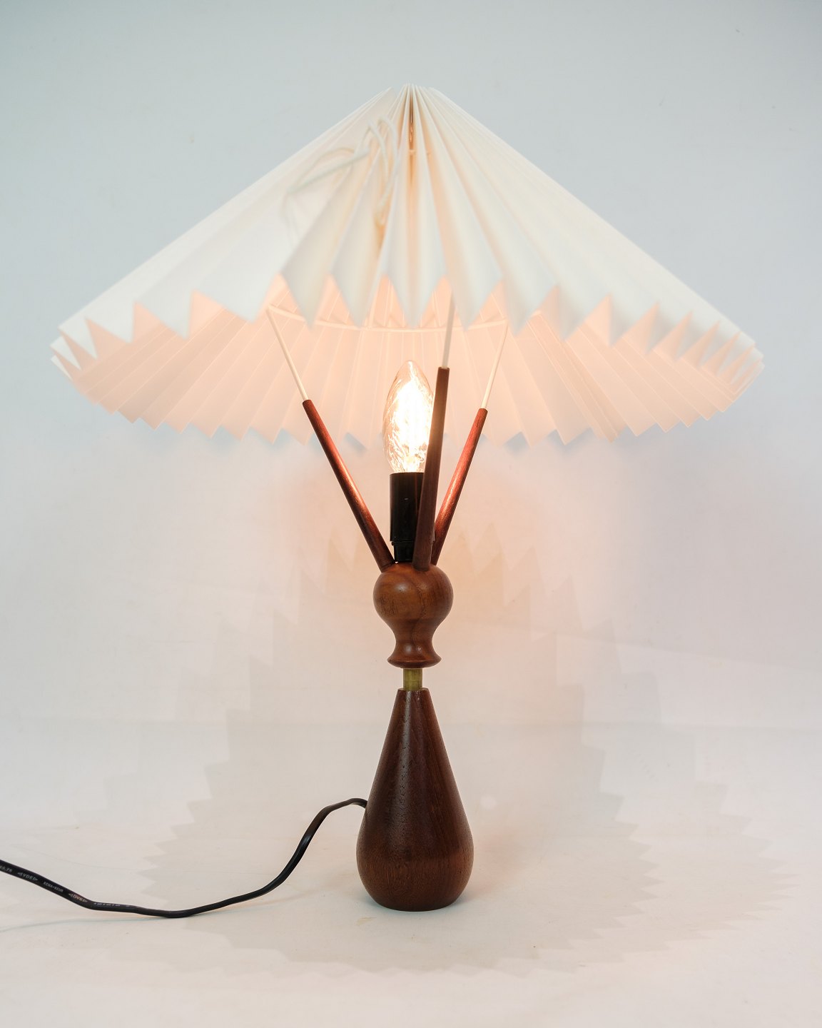 Bordlampe fremstillet i teak med tilhørende skærm, dansk design i 1960'erne. Lampen er udført i minimalistiske stil, hvor teaktræet giver et varmt og naturligt udtryk.