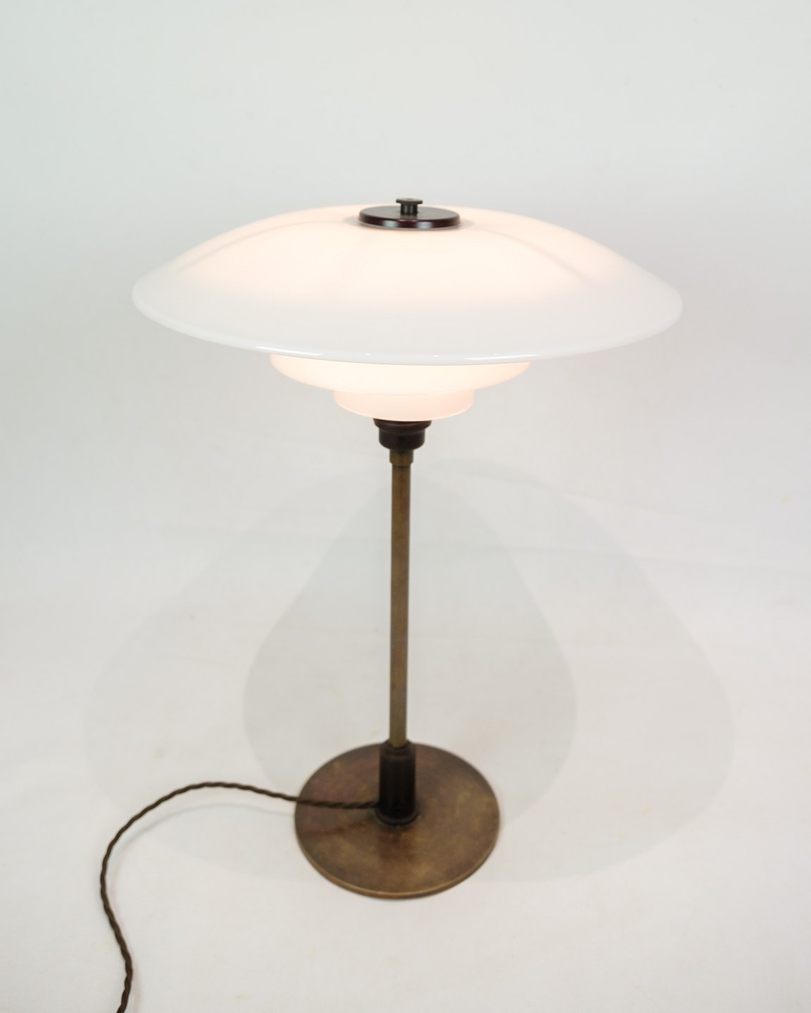 Kontakt os vedrørende prisBordlampe, PH 4/2½, designet af Poul Henningsen og fremstillet af Louis Poulsen i 1930'erne. Lampen er udført med hvide opal glasskærme og et stel af bruneret messing, som giver en klassisk kombination af funktion og elegance. PH-lamperne er kendt for deres unikke design, hvor skærmene er skabt til at sprede lyset jævnt og blødt.