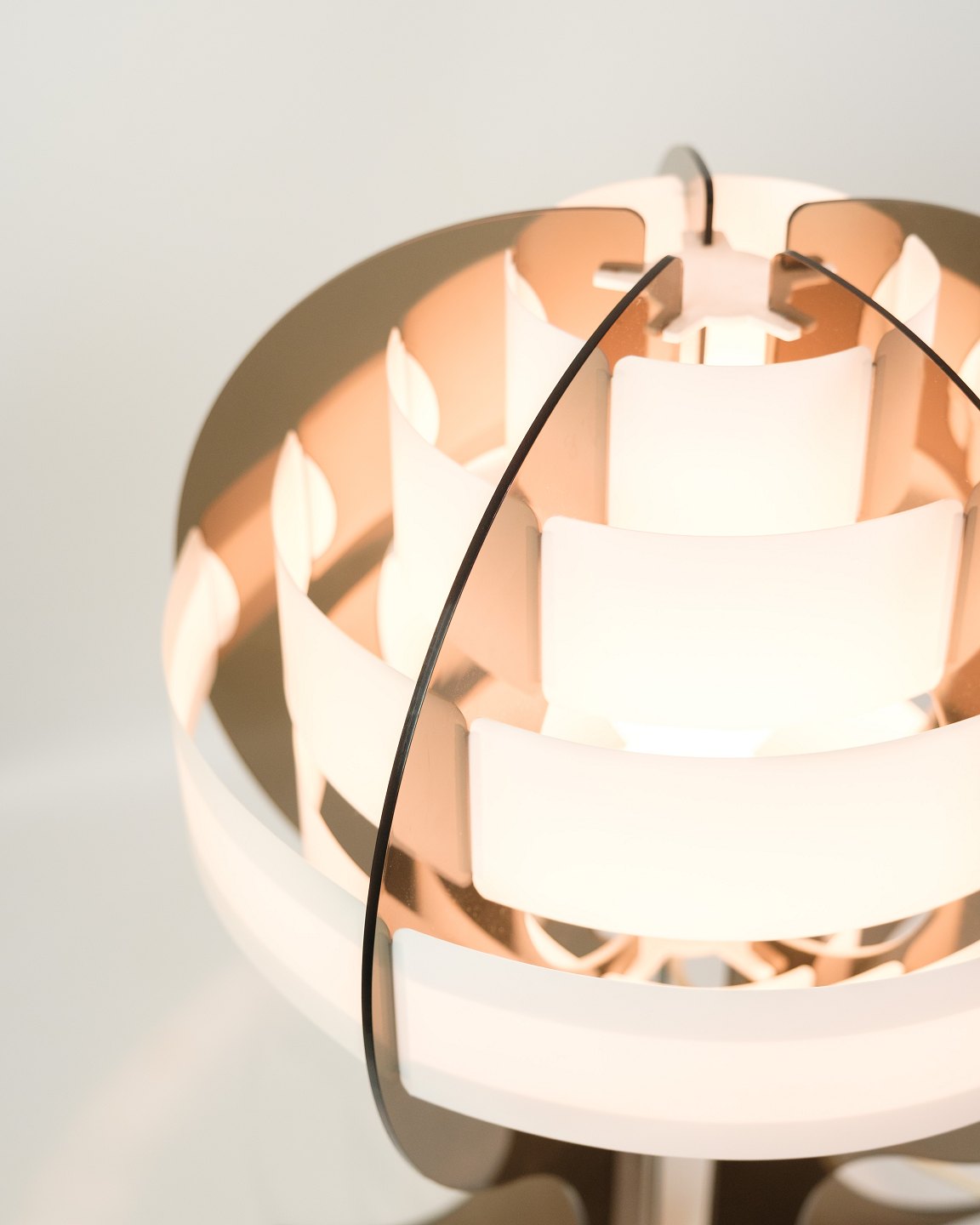Smoked brown acrylic glass and white acrylic strips make this specially shaped Danish table lamp give off a very special and fantastic light.