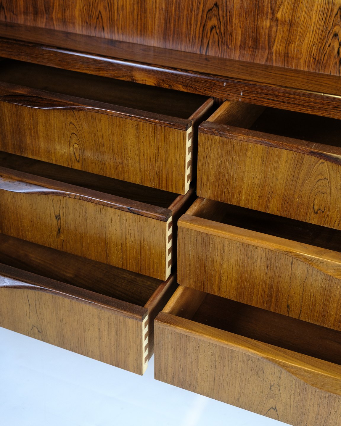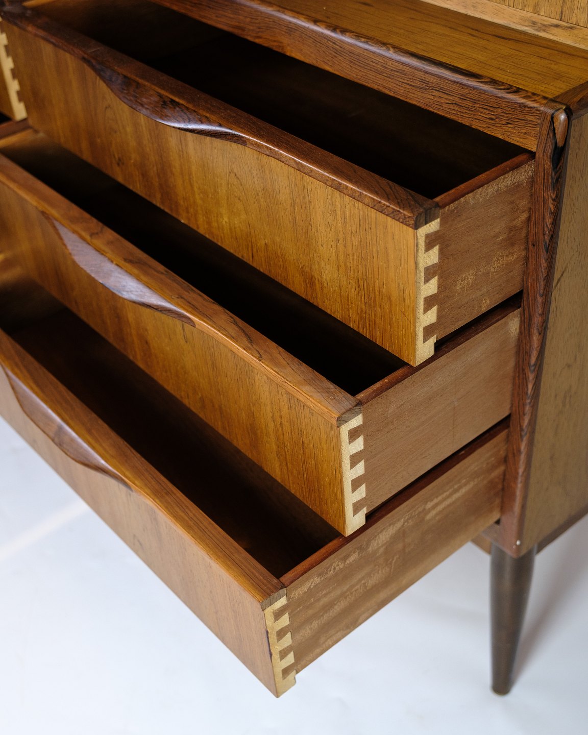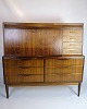 SoldChatol designed by Erling Torvits and made of rosewood. The upper part opens with a hinged door and has built-in drawers, open compartments, letter shelves and three integrated “secret” drawers in the top section. At the bottom, six spacious drawers with molded handles.