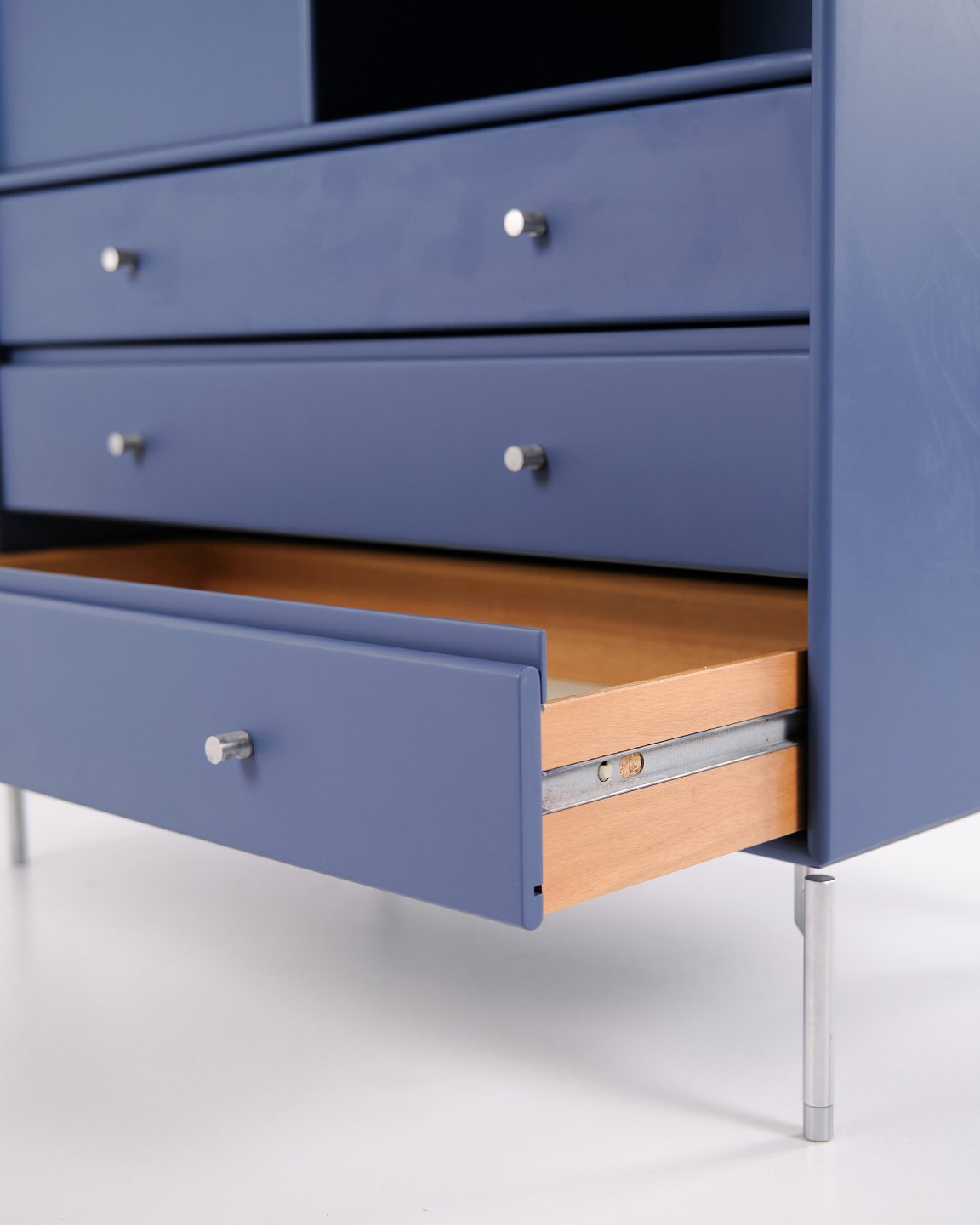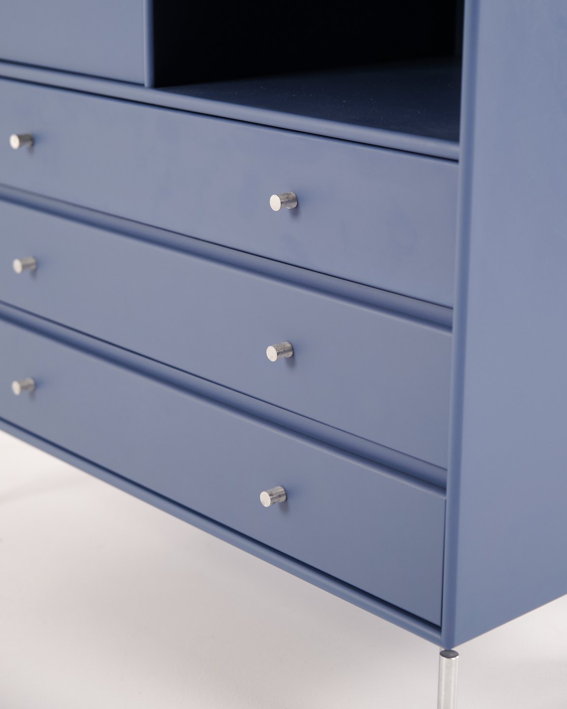 Montana kommode i blå med krom ben. Modulet er indrettet med tre skuffer og én låge, hvilket giver praktisk og fleksibel opbevaring. Et klassisk Montana-design med enkel struktur og høj funktionalitet.