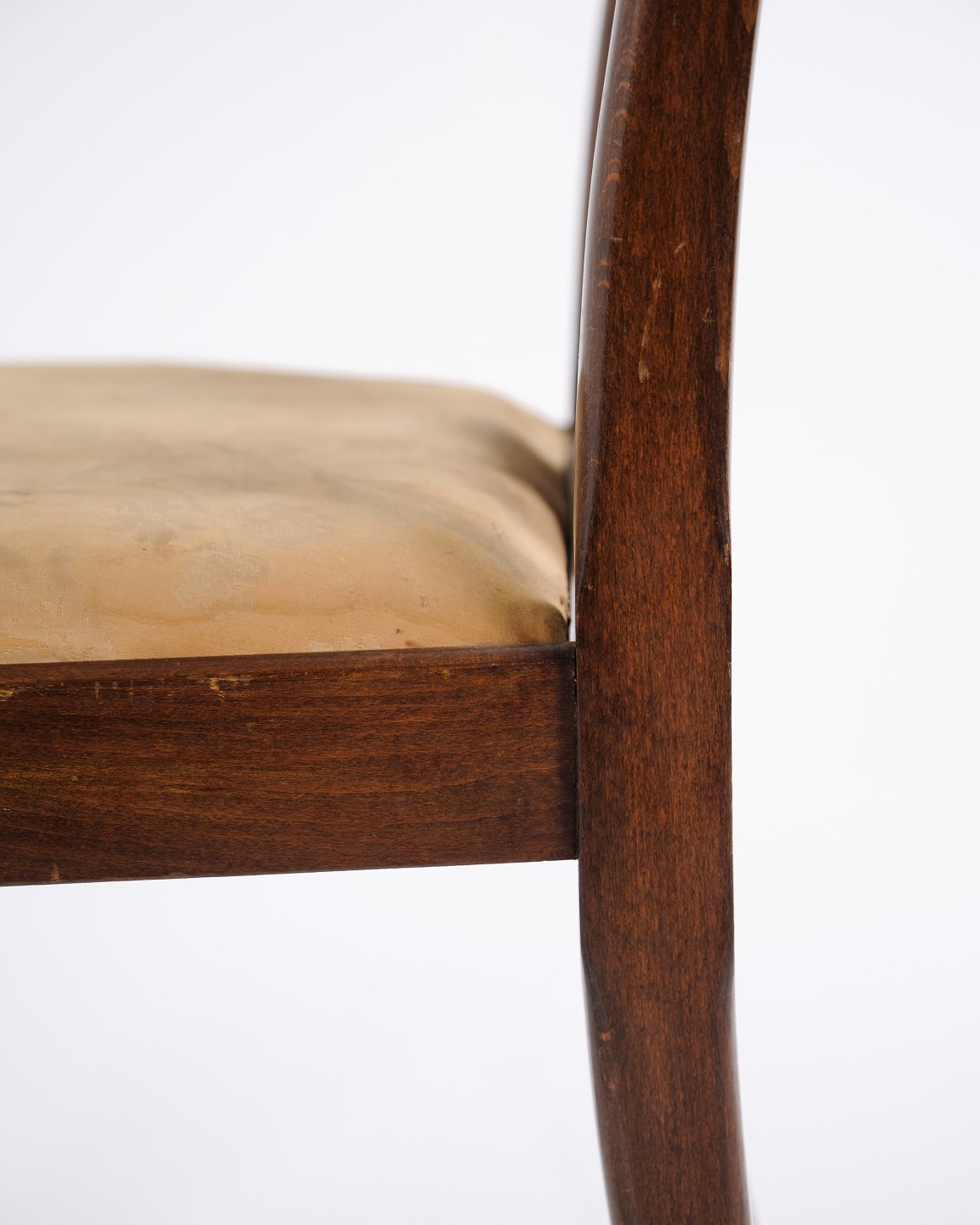 Sæt af tre spisebordsstole i Louis XV stil fra 1900-tallet, udført i mahogni med udskårne detaljer og polstret med blomstret stof. Klassiske og dekorative stole, velegnede til spiseområde eller stue. Solidt håndværk med tidstypisk formsprog.