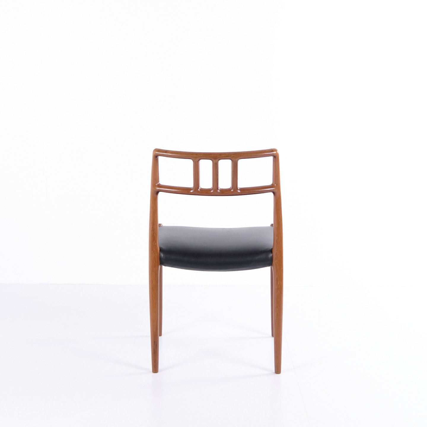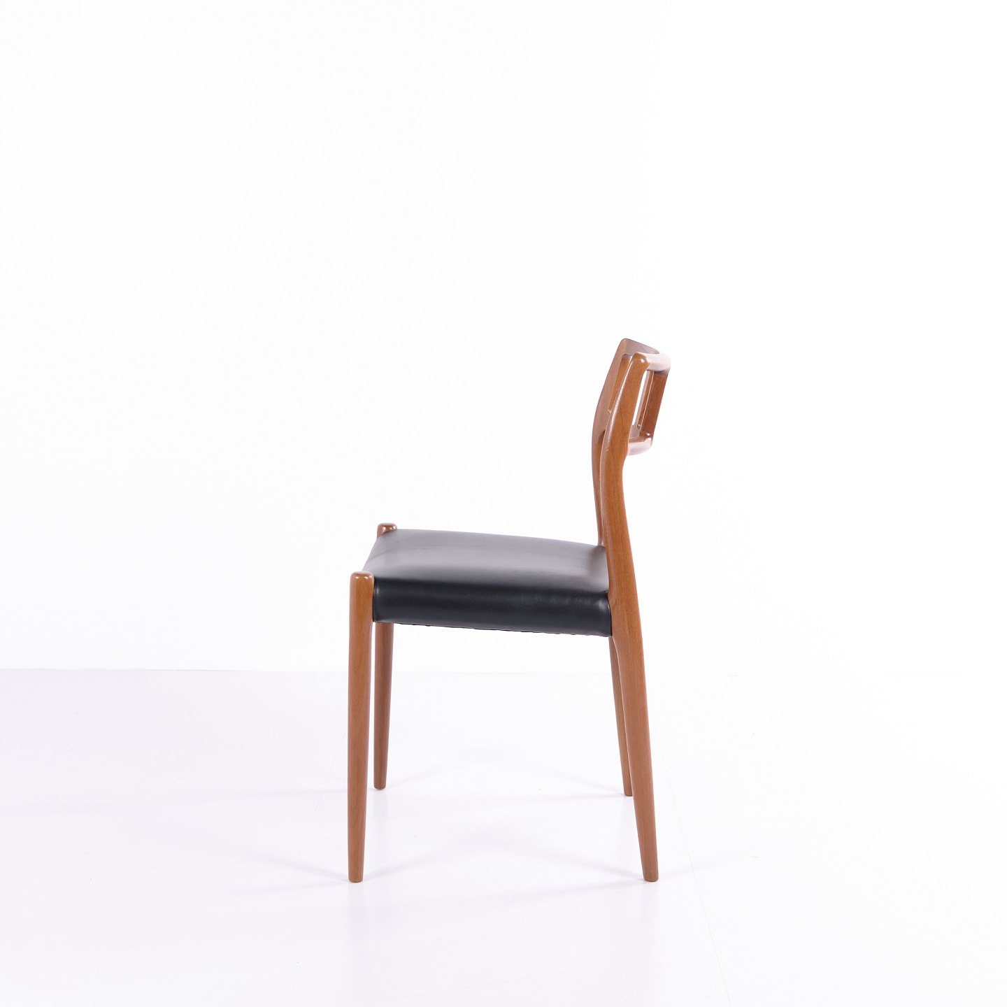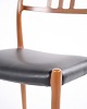 Spisebordsstol model 79, designet af Niels Otto Møller og fremstillet af JL Møllers Møbelfabrik i 1960’erne. Udført i teak med sort lædersæde. Et klassisk Møller-design, kendt for høj håndværkskvalitet og elegant form.