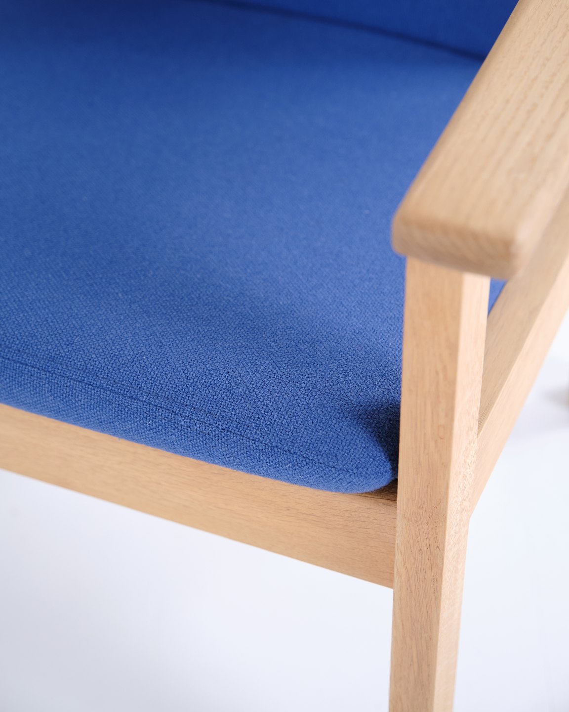 Lounge chair model GE 284 designed by Hans J. Wegner and produced by Getama. Made with a solid oak frame and loose cushions upholstered in blue wool. A classic Wegner design offering comfort and a compact form suitable for both modern and traditional interiors.