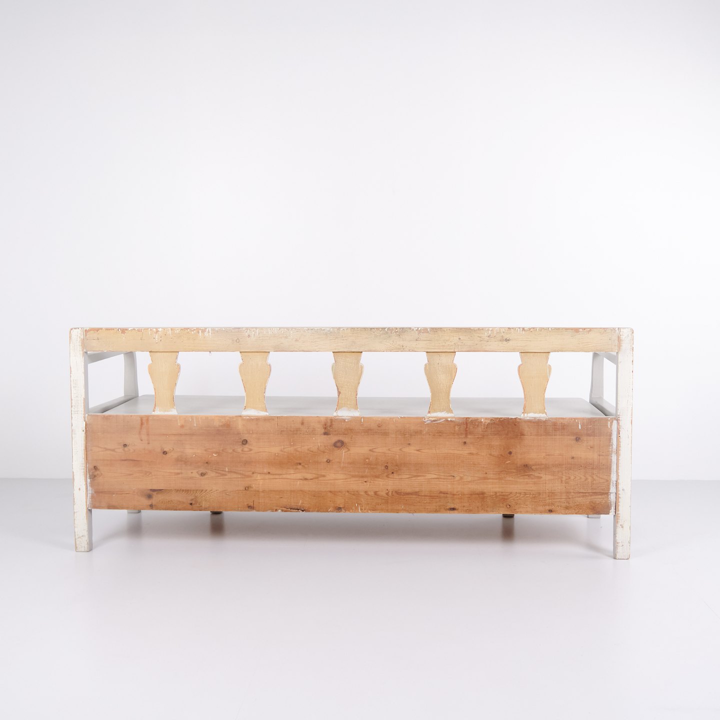 Antik slagbænk fra 1860’erne i gråmalet fyrretræ. Klassisk almuedesign med siddeplads og opbevaring. Historisk og funktionelt møbel.
