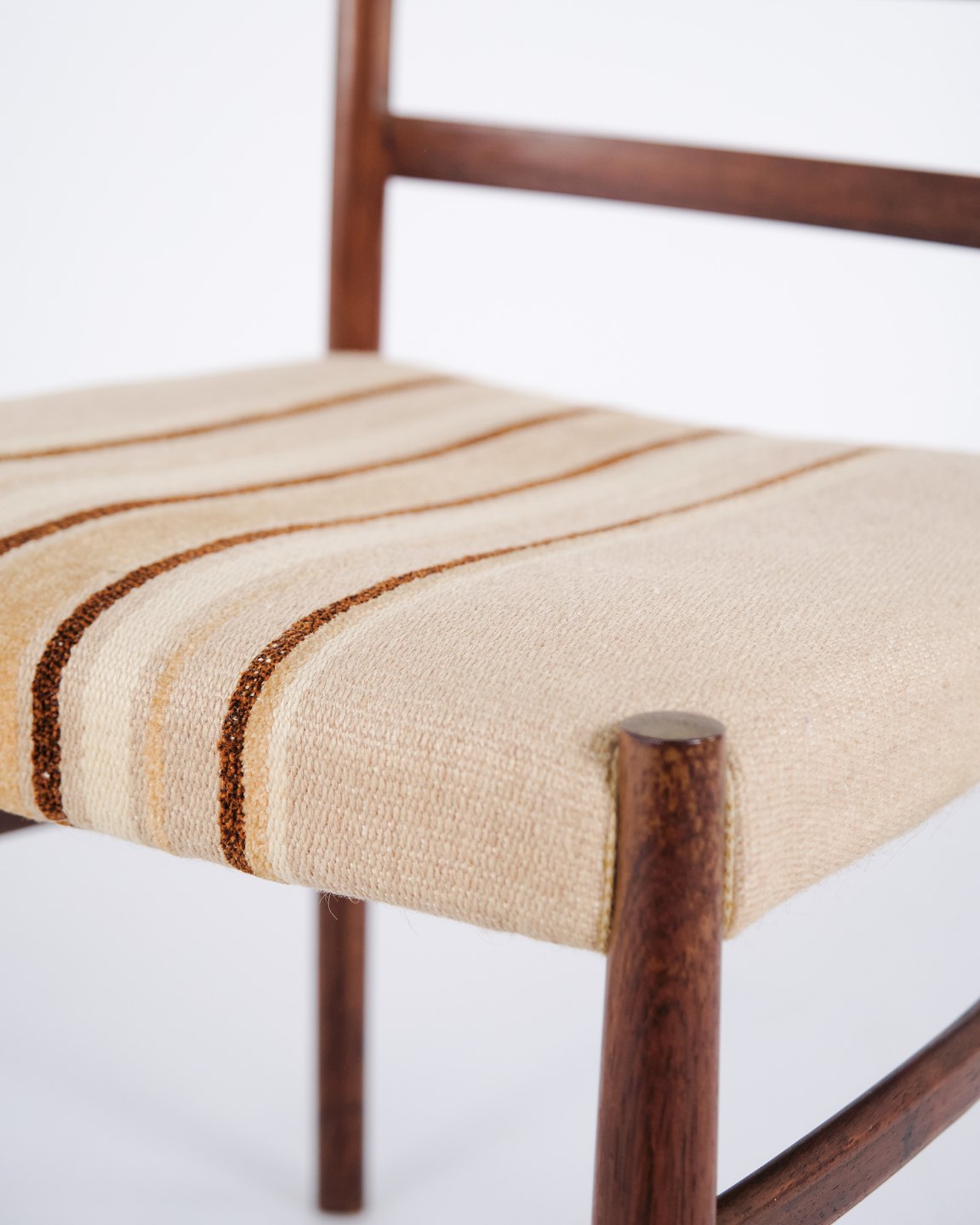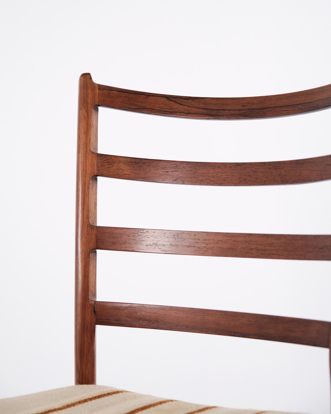 N.O. Møller spisebordsstole i palisander med stribet polster fra 1960’erne. Design af J.L. Møllers Møbelfabrik.