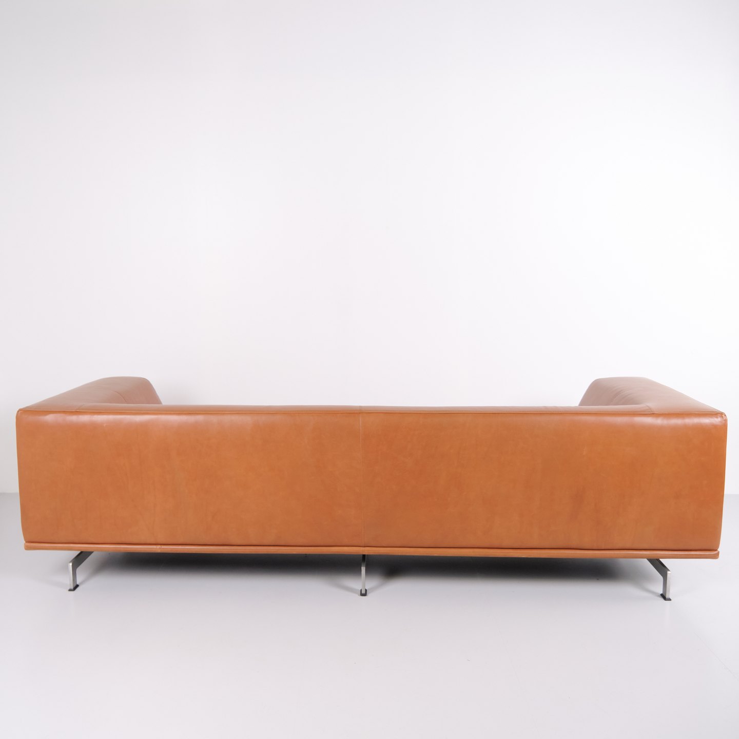 Canapé Delphi modèle EJ 450 d’Erik Jørgensen conçu par Hannes Wettstein en cuir cognac avec structure en aluminium brossé. Design scandinave moderne.