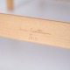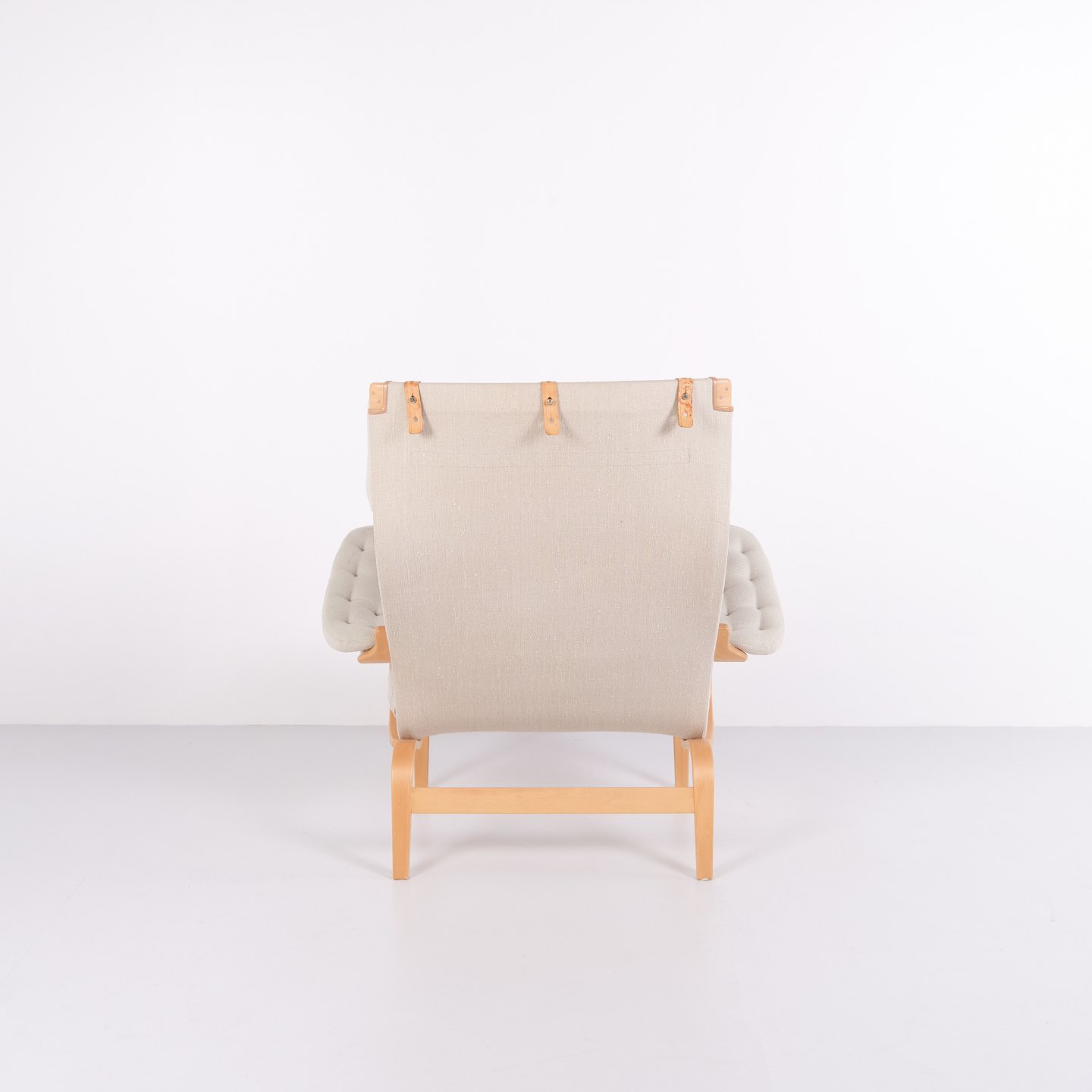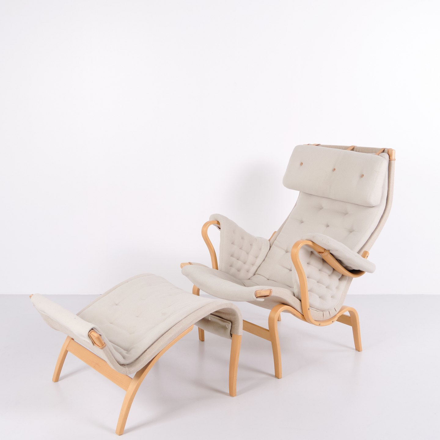 Pernilla lænestol med tilhørende skammel, model 69, designet af Bruno Mathsson og fremstillet af DUX som 35 års jubilæumsudgave. Stolen er udført i bøgetræ med polstring i lyst stof og har et karakteristisk, ergonomisk formsprog, der følger kroppens naturlige kurver og sikrer høj komfort.