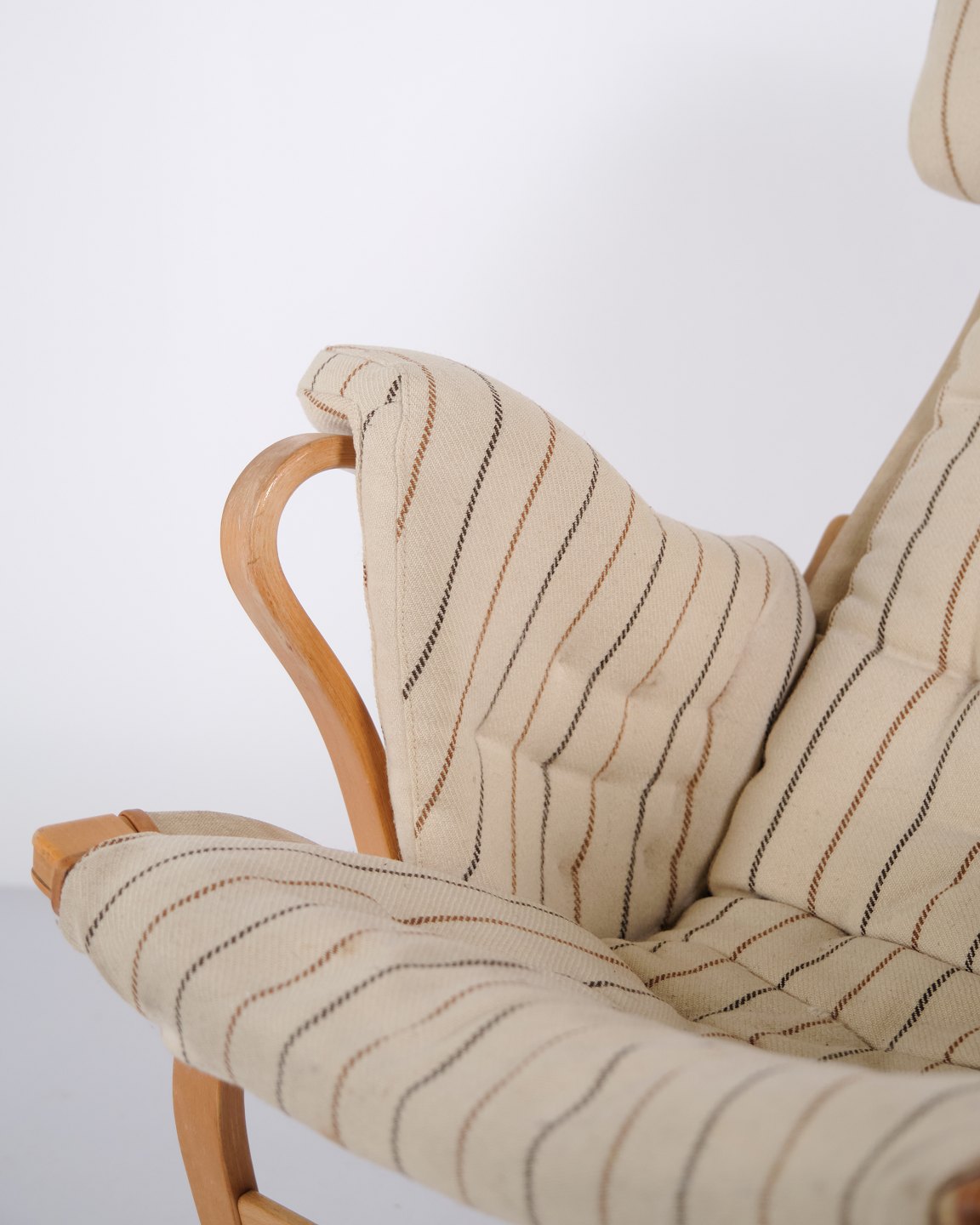 Bruno Mathsson Pernilla armchair model 69 from DUX in striped fabric and beech wood. Classic Scandinavian design from the 1960s.