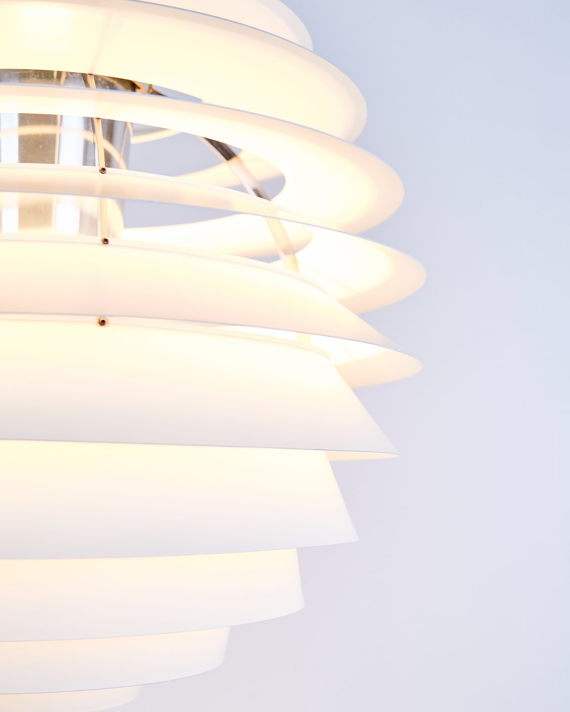 Ikonisk pendel, PH Louvre (tidligere kaldet PH Kugle), designet af Poul Henningsen i 1957 til Adventistkirken i Skodsborg. Lampen er opbygget af 13 lameller monteret på en indre konstruktion, som sikrer et blødt og blændfrit lys. Det kugleformede design skaber en jævn lysfordeling og et skulpturelt udtryk.