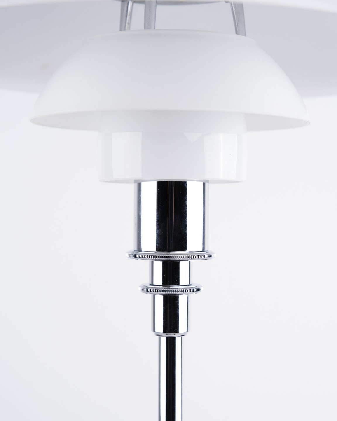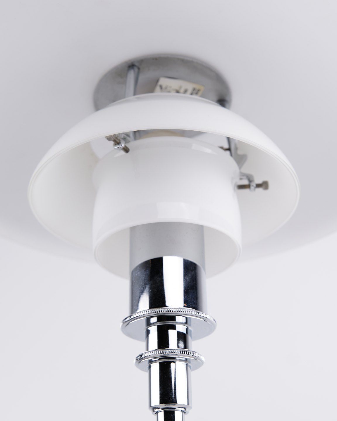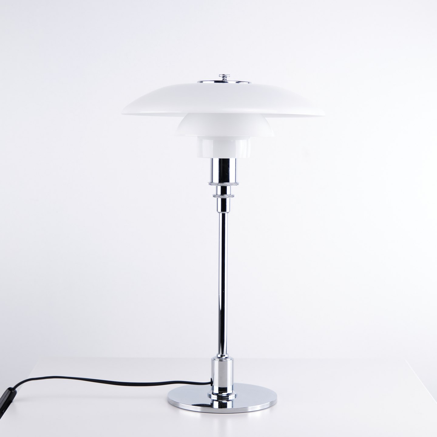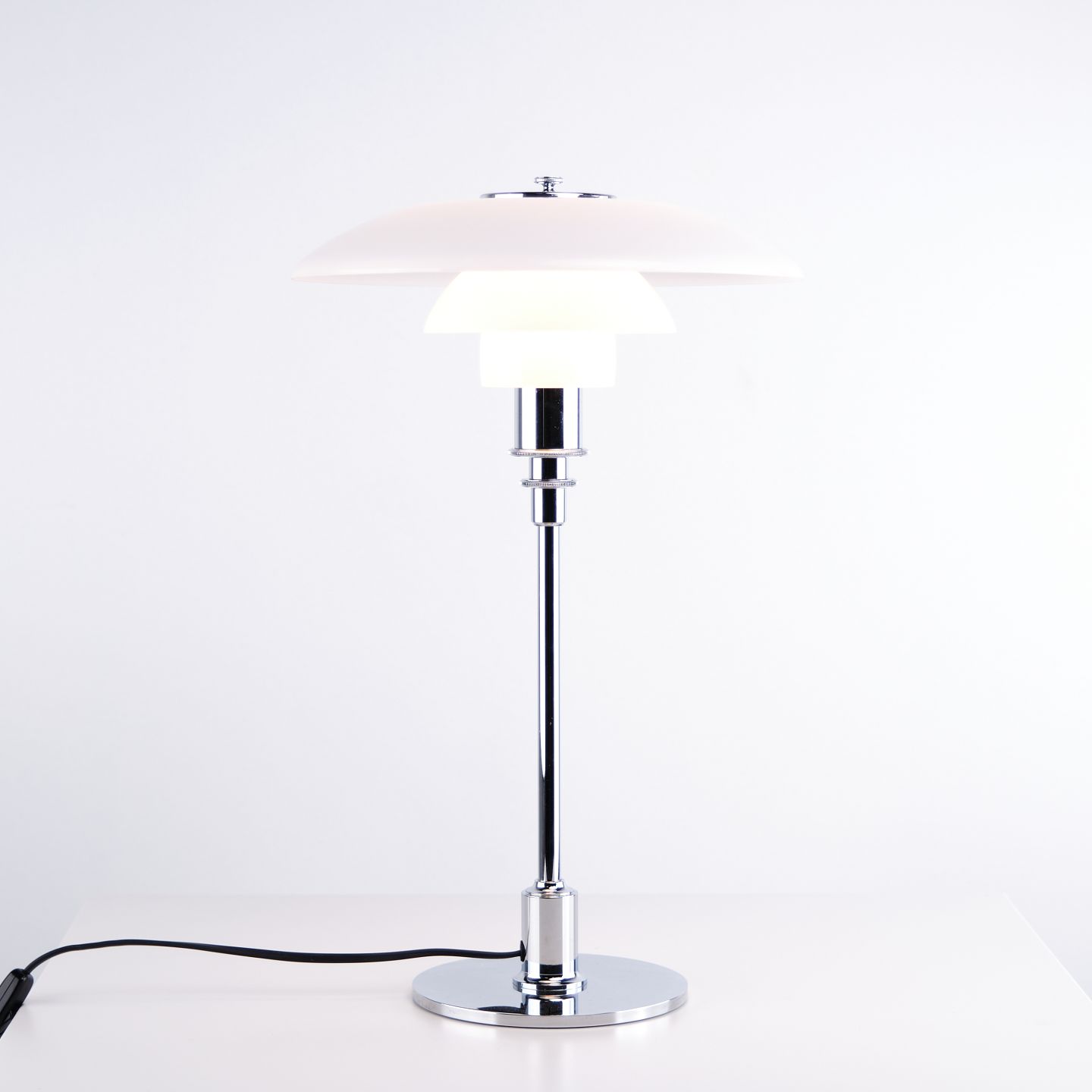 PH 3/2 table lamp designed by Poul Henningsen and produced by Louis Poulsen. The lamp is made with shades in white opal glass, ensuring a soft and glare-free light. The iconic three-shade system is developed for optimal light distribution and is a central element in Henningsen’s design philosophy.