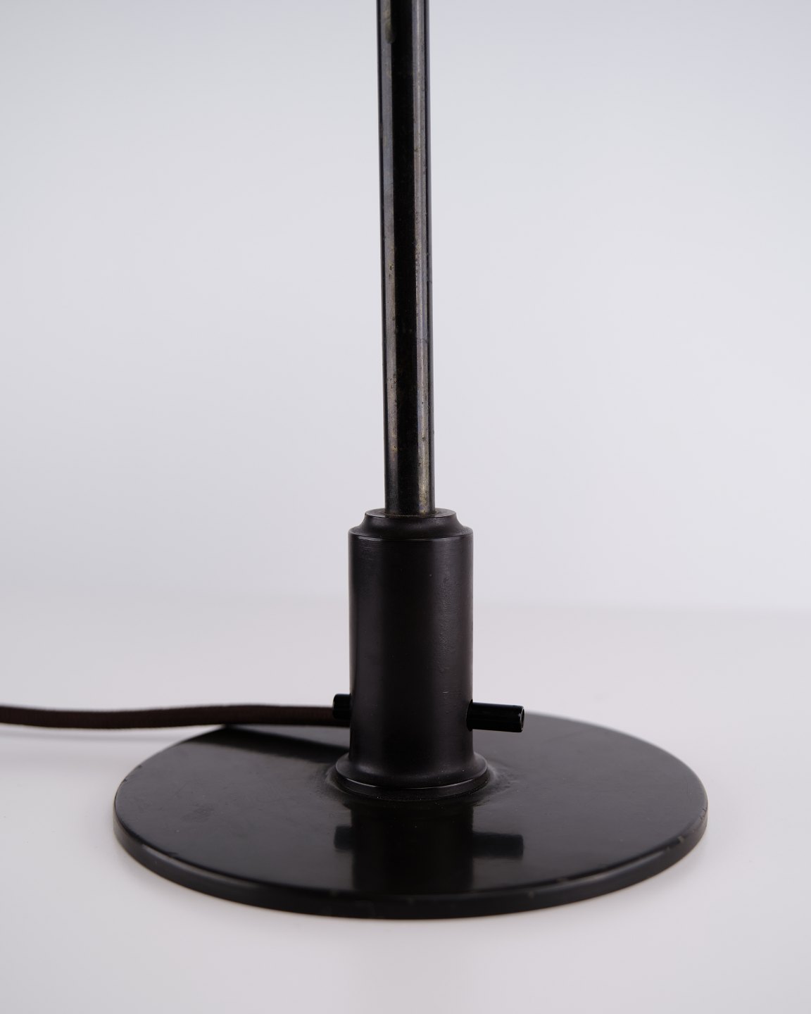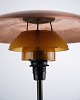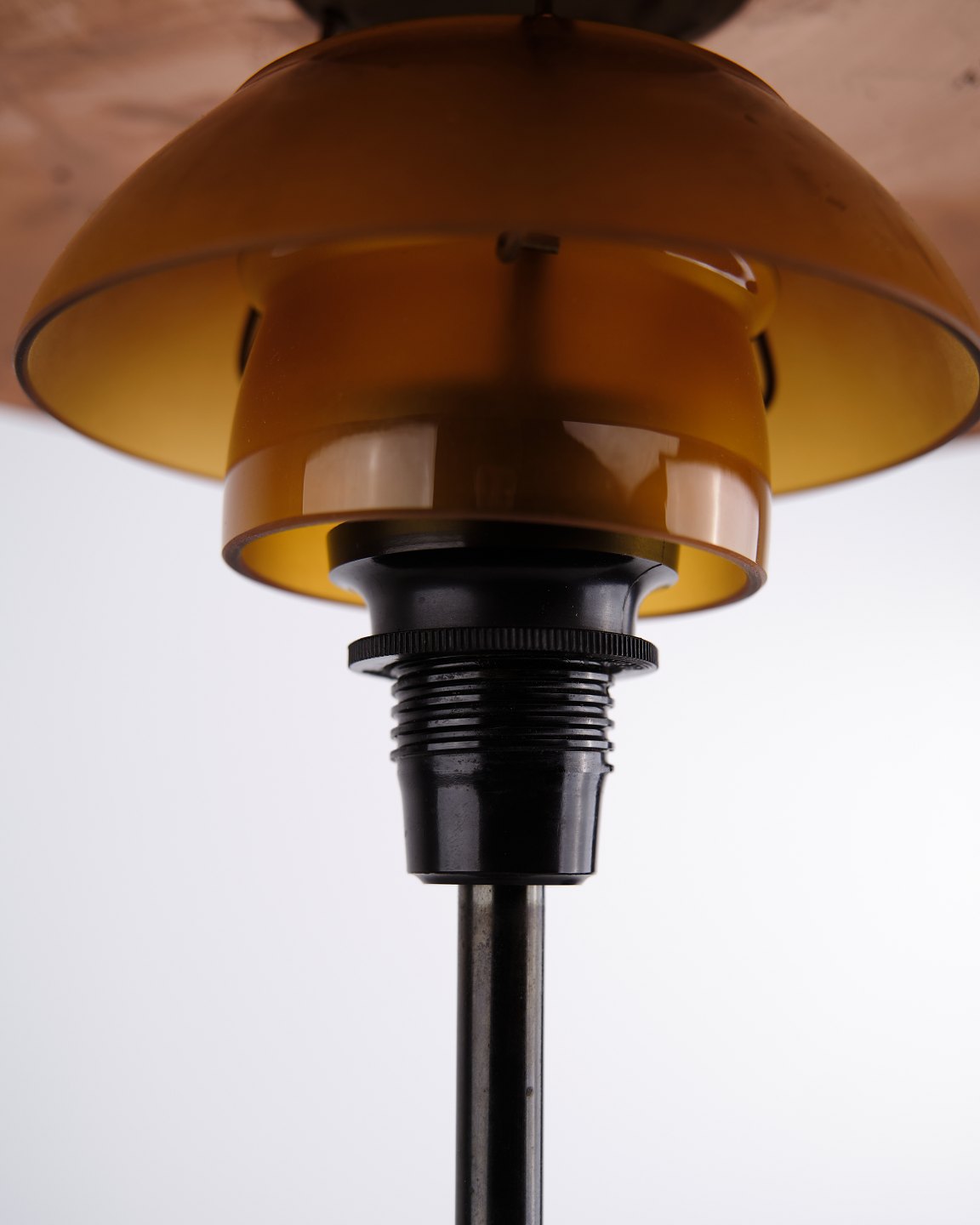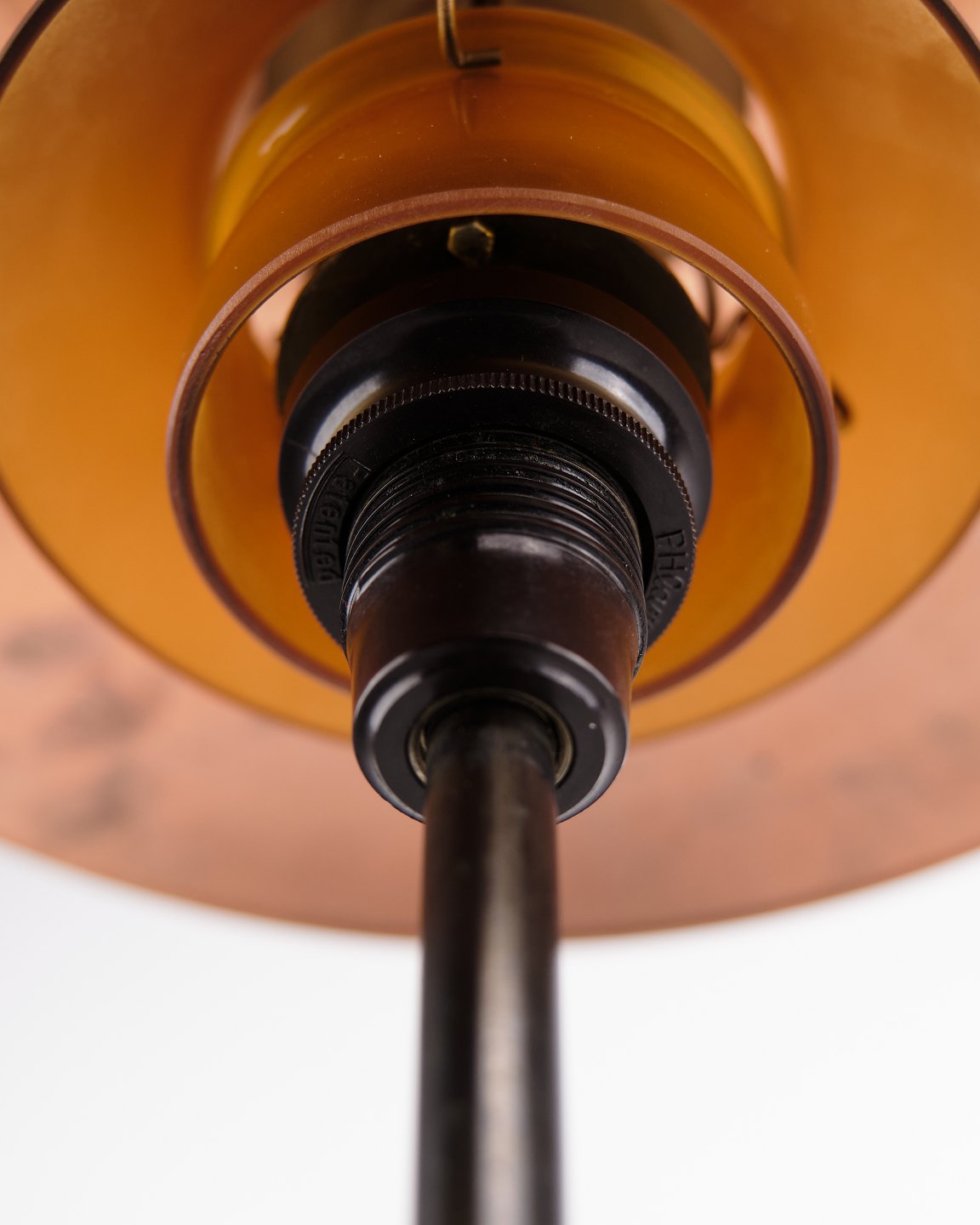 PH 3.5/2 table lamp designed by Poul Henningsen and produced by Louis Poulsen in the 1930s. The lamp is made with a top shade in copper, amber glass shades and a base in burnished brass.