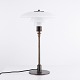 PH 3/2 Treph table lamp designed by Poul Henningsen and released as an anniversary model in 1994 by Louis Poulsen. The lamp is made with a burnished frame and classic shades in white opal glass, ensuring a soft and glare-free light. The iconic three-shade system is developed for optimal light distribution and is a central element in Henningsen’s design philosophy.