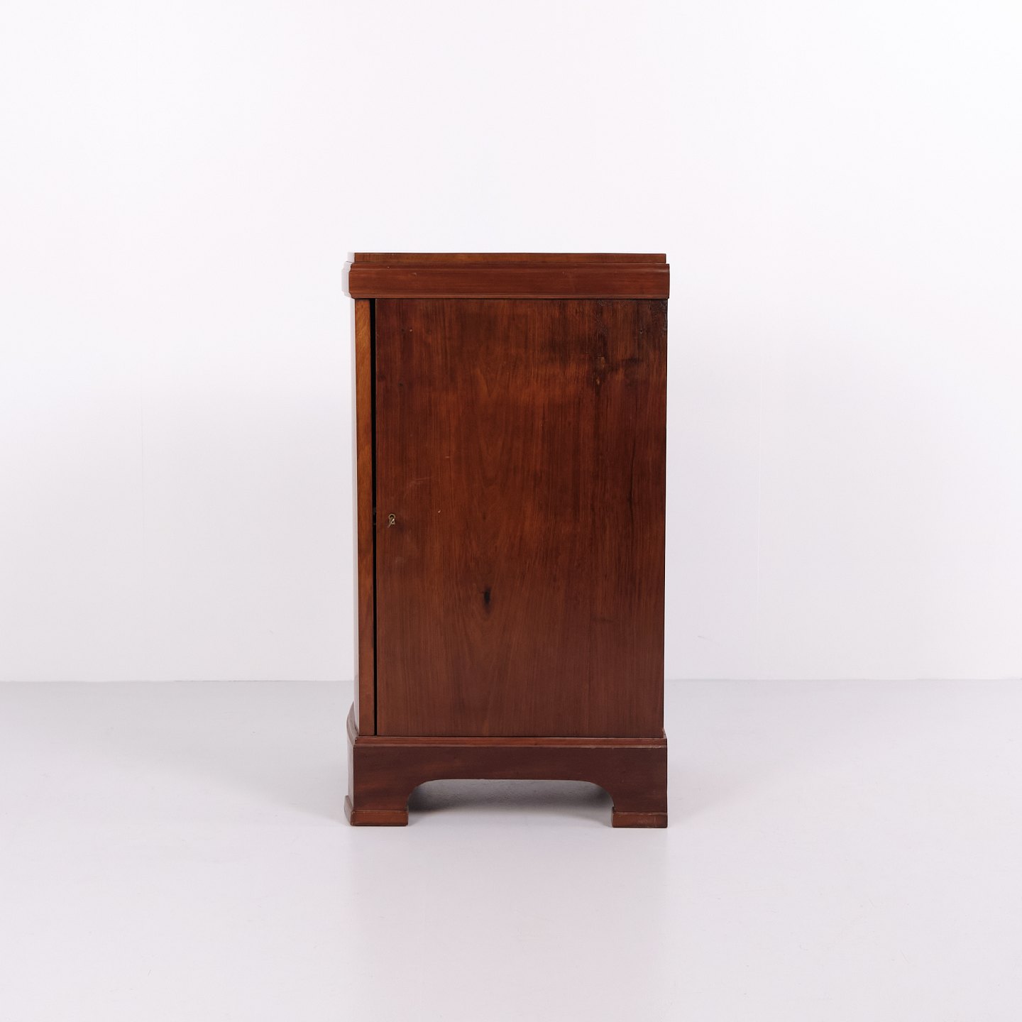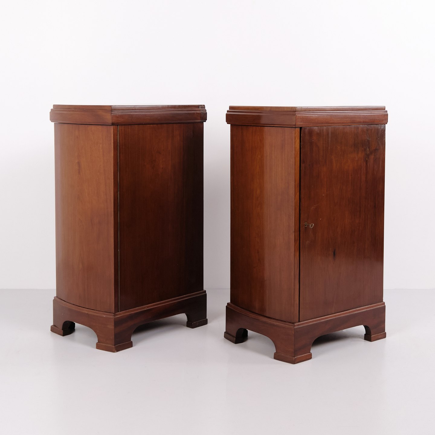 Et Par natborde i mahogni fra 1920’erne med buet front og håndpoleret overflade. Klassisk design med elegant udtryk.