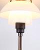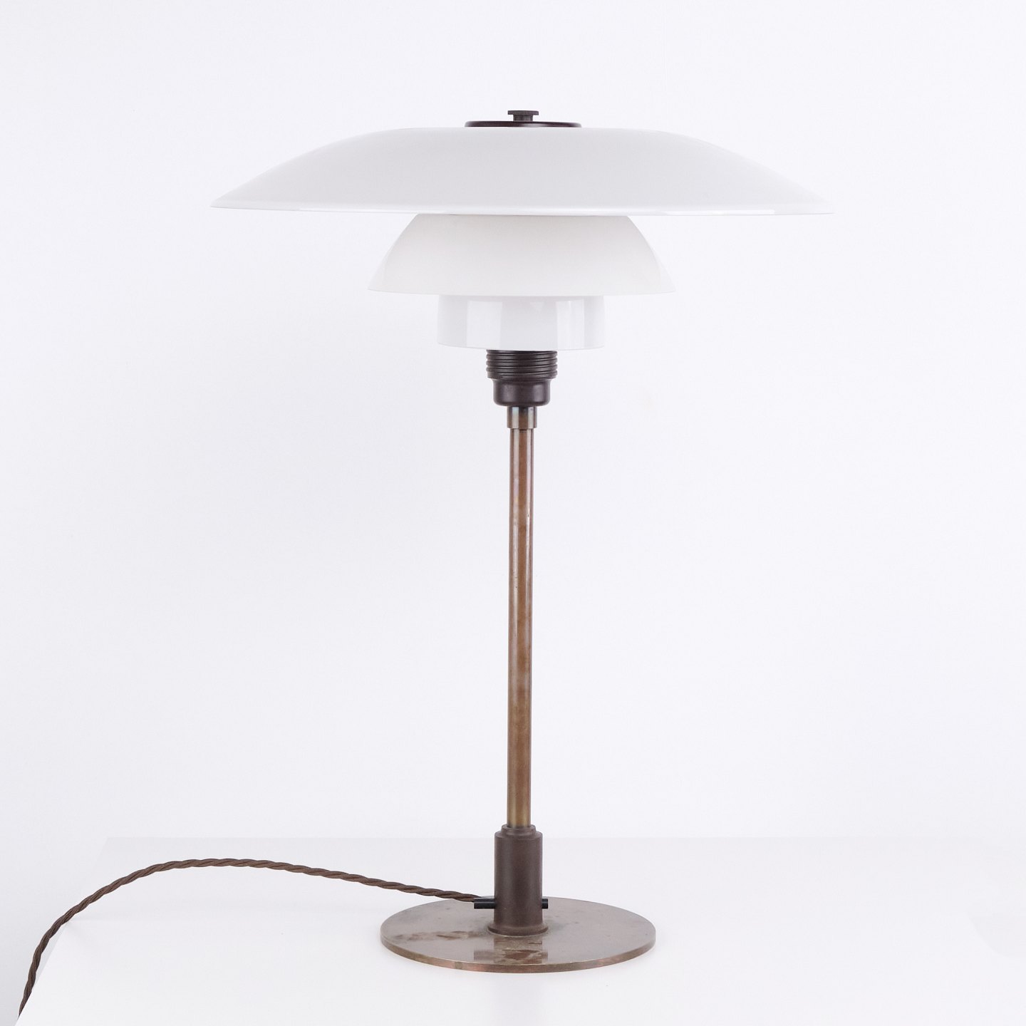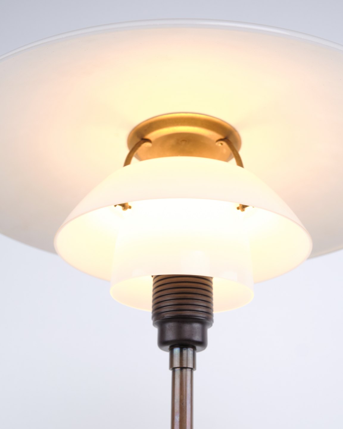 PH 4/3 bordlampe designet af Poul Henningsen og fremstillet af Louis Poulsen i 1930’erne. Lampen er udført i bruneret messing med skærme i hvidt opalglas, hvilket giver et varmt og afbalanceret lys. Det ikoniske flerskærmssystem er udviklet til at sikre blændfri belysning og optimal lysfordeling.