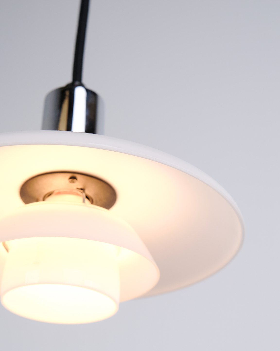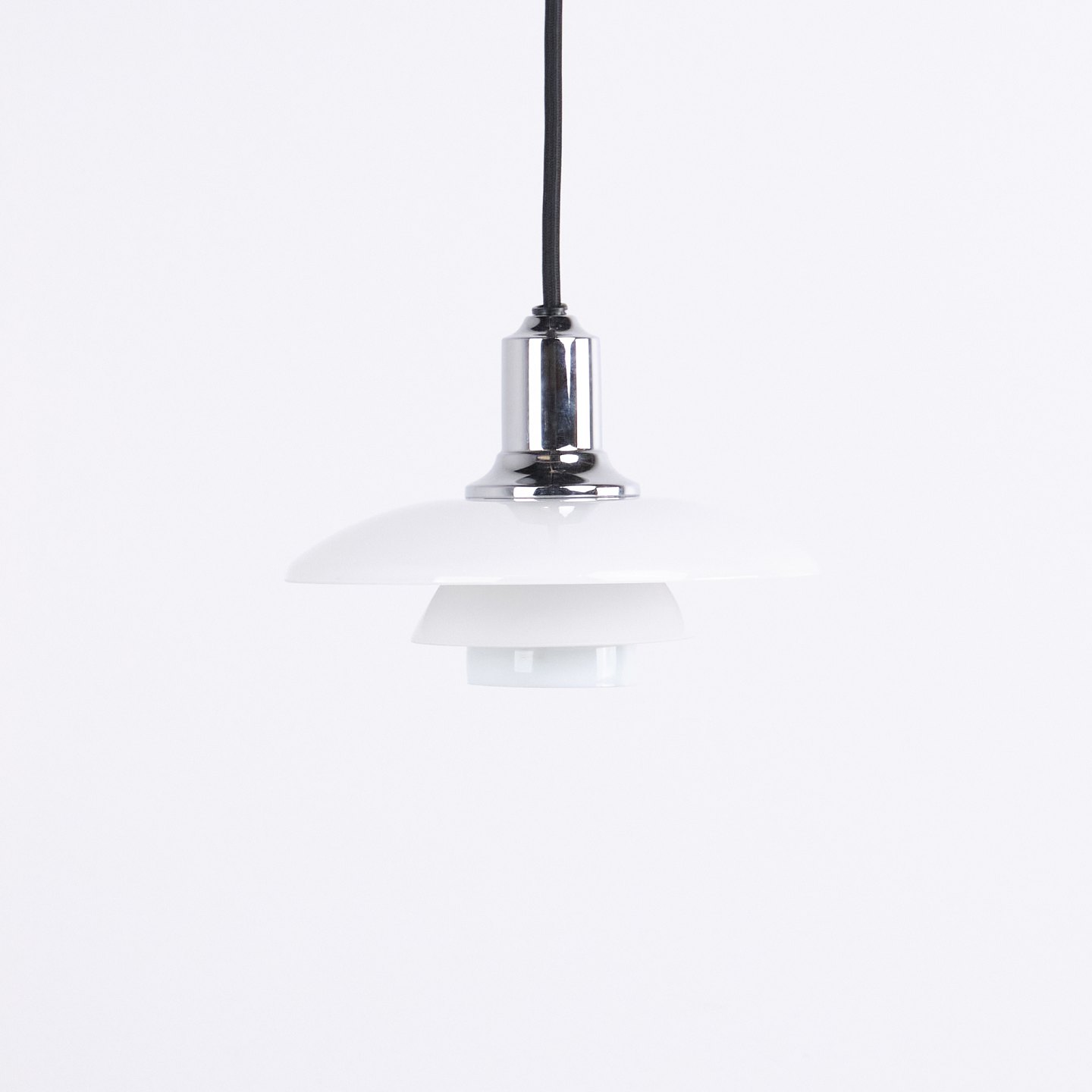PH 2/1 pendant in chrome with opal glass from Louis Poulsen. Designed by Poul Henningsen with classic Danish lighting design and glare-free illumination.