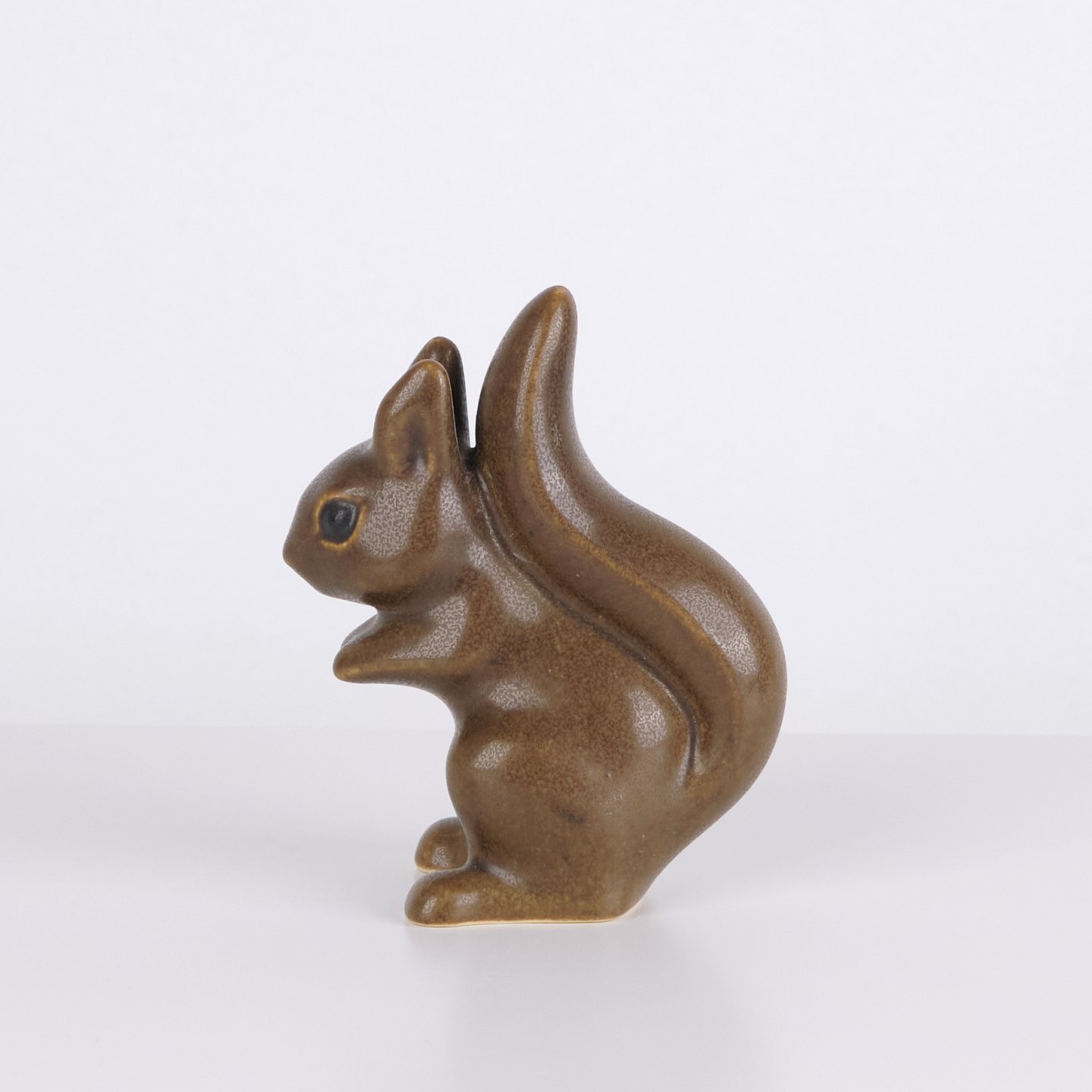 Harefigur af Knud Basse udført i brun glaseret keramik. Modellen viser opret siddende hare med samlet forpoter og markant haleform bagtil. Figuren er dekoreret med lys detalje på fronten og er et klassisk eksempel på Knud Basses populære dyrefigurer fra 1960’erne.