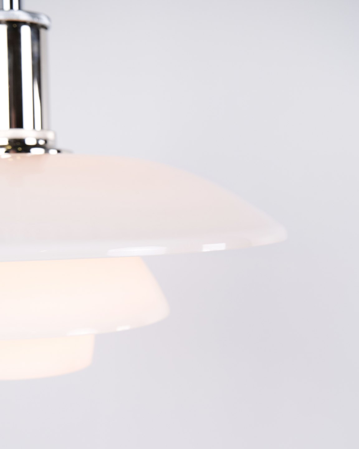 PH 4½-4 pendel designet af Poul Henningsen for Louis Poulsen. Lampen er udført med mundblæste treskærme i hvidt opalglas og kromophæng. Modellen har en overskærm på ca. 45 cm og anvender de nedre skærme fra PH 4/4-serien, udviklet for at give bredere lysfordeling ved lav ophængning over spisebord eller bordflade. Den nuværende version blev introduceret i 1980 og er en del af PH-seriens ikoniske blændfrie belysningssystem.