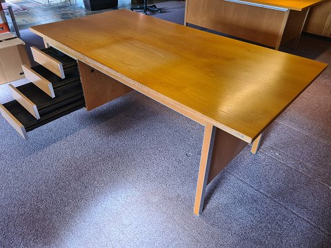 Stort Skrivebord fra 1980'erne i eg og aluminium. Fremstår pænt, velholdt og udmærket funktionsdygtigt. Dog med meget let afblegning på bordpladen efter en skrivemåtte. (Ses på billede)