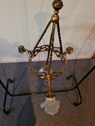 Messing lysekrone med 4 glas skærme fra 1920erne.